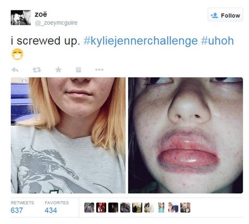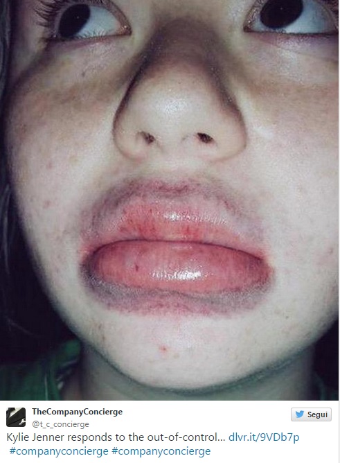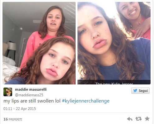 ROMA – La sorellastra di Kim kardashian Kylie Jenner ha le labbra “a canotto”. Su Twitter e su Facebook, per imitare le sue è nato un nuovo pericoloso gioco che si chiama Kylie Jenner Challenge (l’hastag è #KylieJennerChallenge). Lo scopo è di postare foto che sono il risultato dell’aver gonfiato per qualche minuto le labbra in un collo di bottiglia o un bicchiere di plastica in modo da farle diventare enormi per l’eccessiva pressione. Il gioco social è sfociato in lividi, gonfiori e irritazioni: alcuni hanno persino postato le foto delle ecchimosi e dei tagli profondi che si sono procurati a causa dell’eccessiva pressione che si crea all’interno delle labbra.