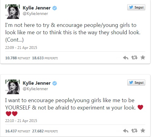 Anche perché a differenza loro, le sorelle Kardashian si sono affidate tutte alla chirurgia estetica, che risulta decisamente più sicura di questo metodo. La sorellastra di Kim, nata dal matrimonio tra la mamma Kris e Bruce Jenner, ha riposto al gioco postando questo commento su Twitter