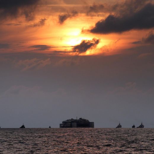 ore 10-12 – Ai 4 rimorchiatori presenti se ne affiancheranno altri 4 in corrispondenza dei quattro cassoni di galleggiamento agli angoli della nave, per garantire il posizionamento in parallelo alla diga nella fase di entrata nel porto