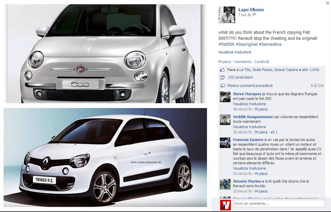 ROMA – Lapo Elkann accusa Renault dal suo profilo Facebook ufficiale di aver copiato la Fiat 500. La vettura in questione accusata di “plagio” e prodotta dalla casa francese è la nuova Twingo, presentata all’ultimo Salone di Ginevra.