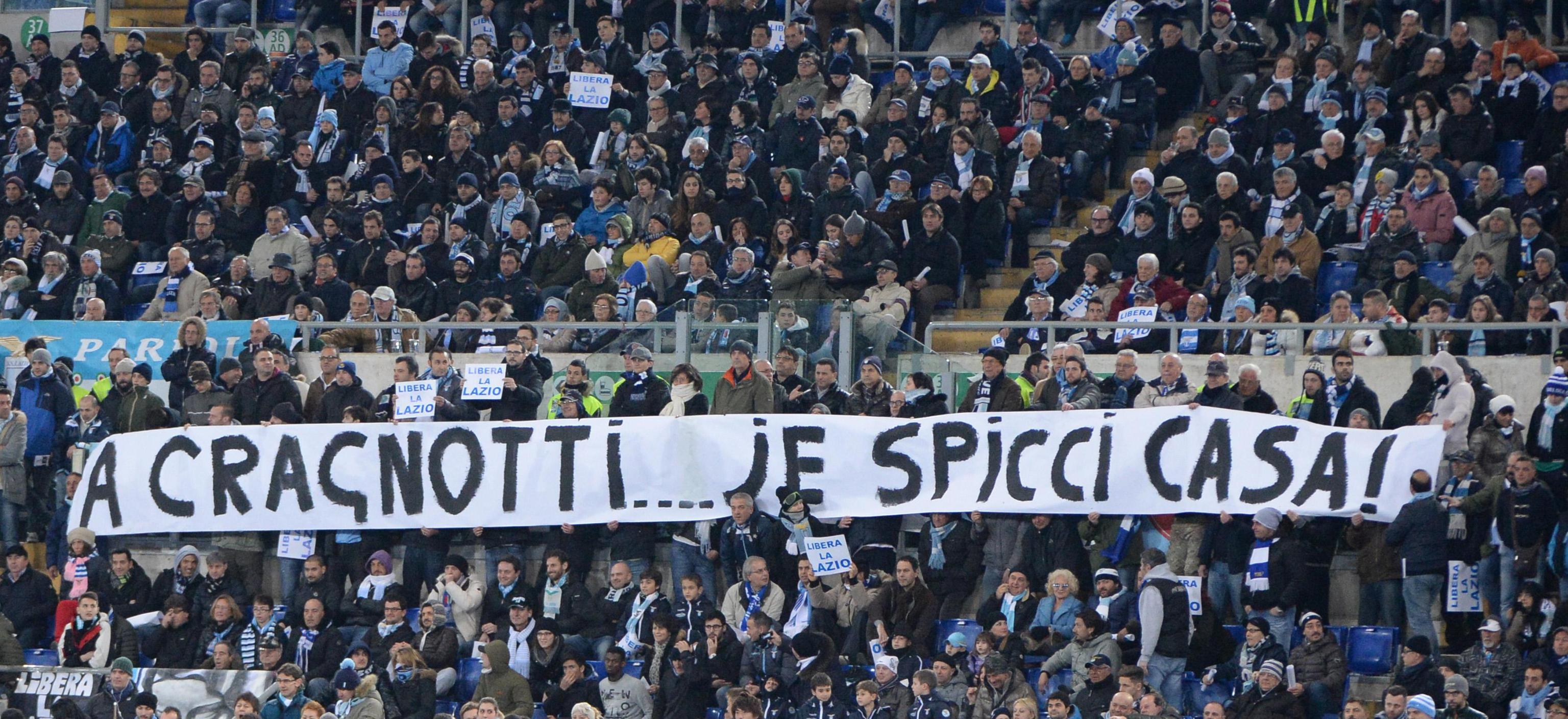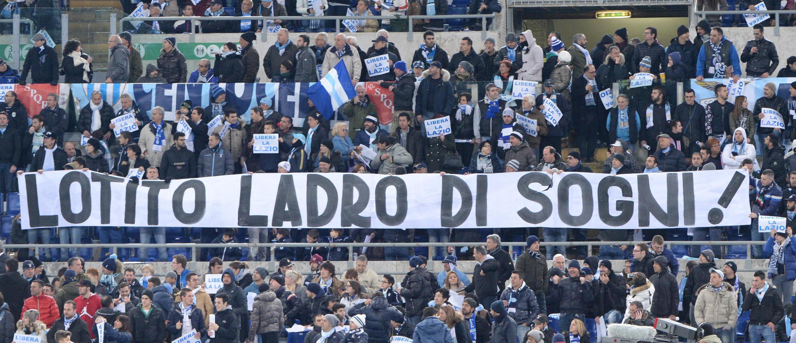 ROMA – Nuova contestazione dei tifosi della Lazio contro il presidente Claudio Lotito. Durante la partita col Sassuolo, allo stadio Olimpico sono stati esposti vari striscioni con il classico “Vattene”, l’epiteto “Lotirchio” e soprattutto i laziali hanno inneggiato a Sergio Cragnotti, il presidente dell’ultimo scudetto (ma anche quello dei debiti e del crac Cirio)