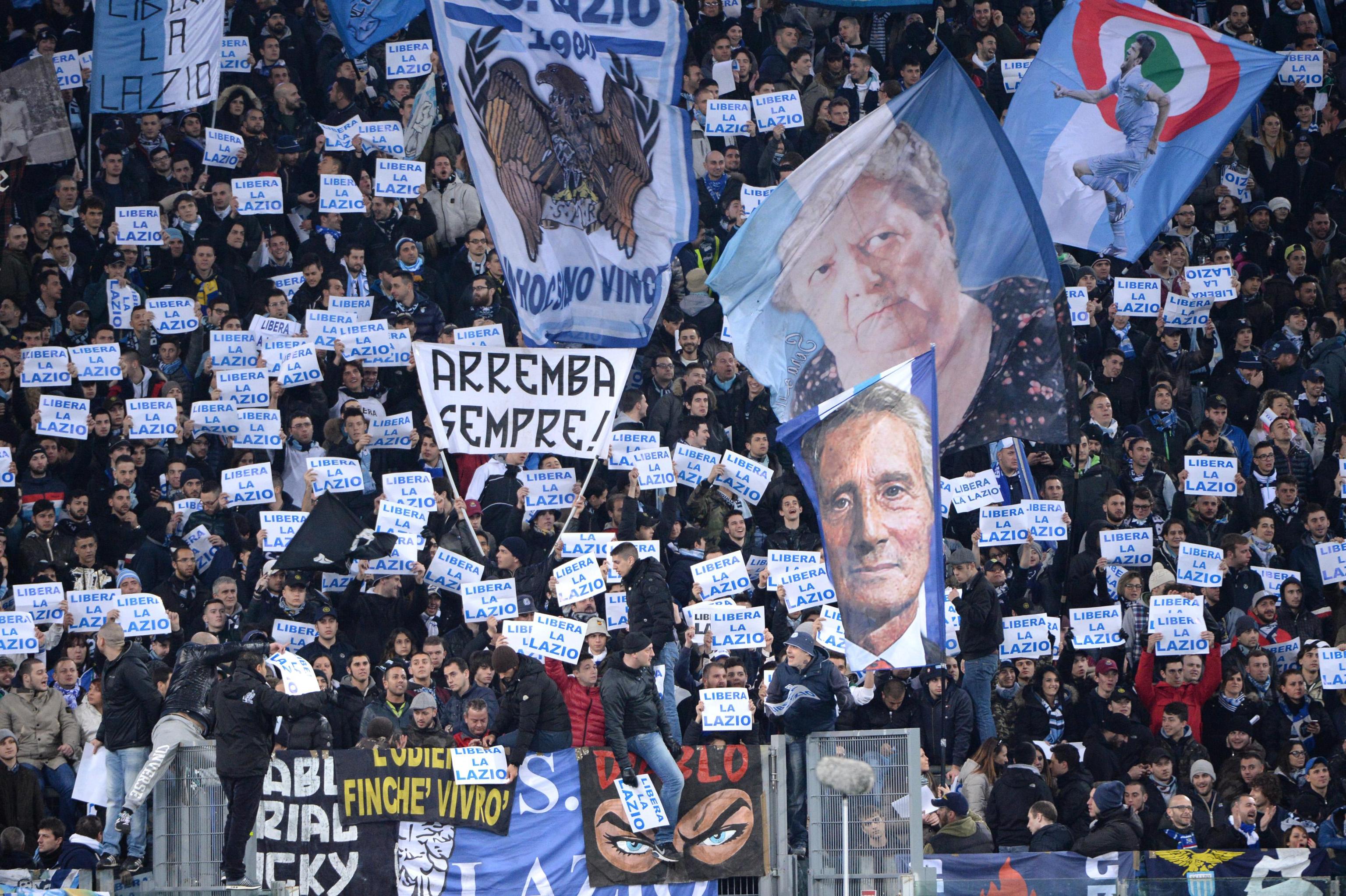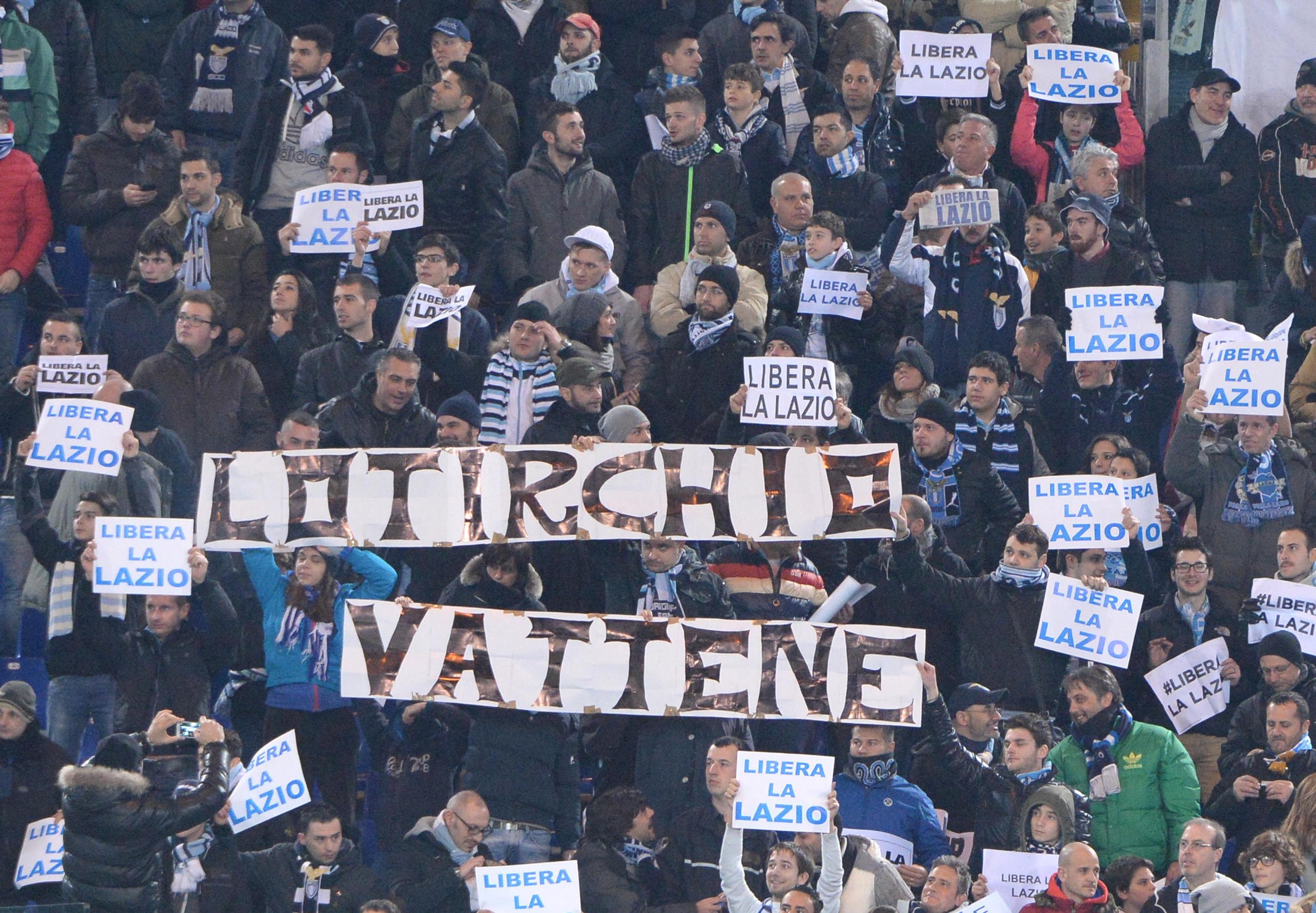 Nel ‘muro’ di cartoncini con la scritta ‘Libera la Lazio’ esposti in tutti i settori dello stadio Olimpico spiccavano numerosi striscioni: ”Lotito ladro di sogni”, ‘Lotito vattene”, ‘O noi o lui’, ‘Sei come Cimabue fai una cosa e ne sbagli due”, sono alcune delle scritte mostrate nel corso del match il Sassuolo.