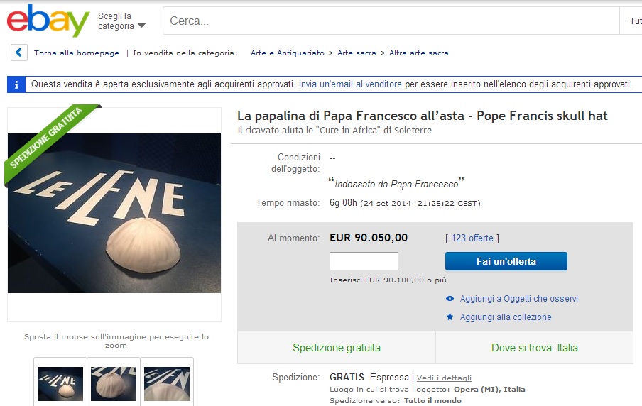 La papalina potrà essere acquistata in tutto il mondo attraverso eBay, uno dei più grandi siti di e-commerce global. L’asta online, che rimarrà aperta per sette giorni, fino al 24 settembre, era partita con una base di un euro.