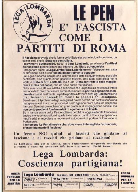 C’รจ scritto in testa, aย caratteri grossi, che “LE PEN ร FASCISTA COME I PARTITI DI ROMA”, e in calce “UN FERMO NO! QUINDI AI FASCISTI CHE GRIDANO AL FASCISMO E AI RAZZISTI CHE GRIDANO AL RAZZISMO”. Poi un invito a ricordarsi delle radici della Lega: “LEGA LOMBARDA! COSCIENZA PARTIGIANA!”.