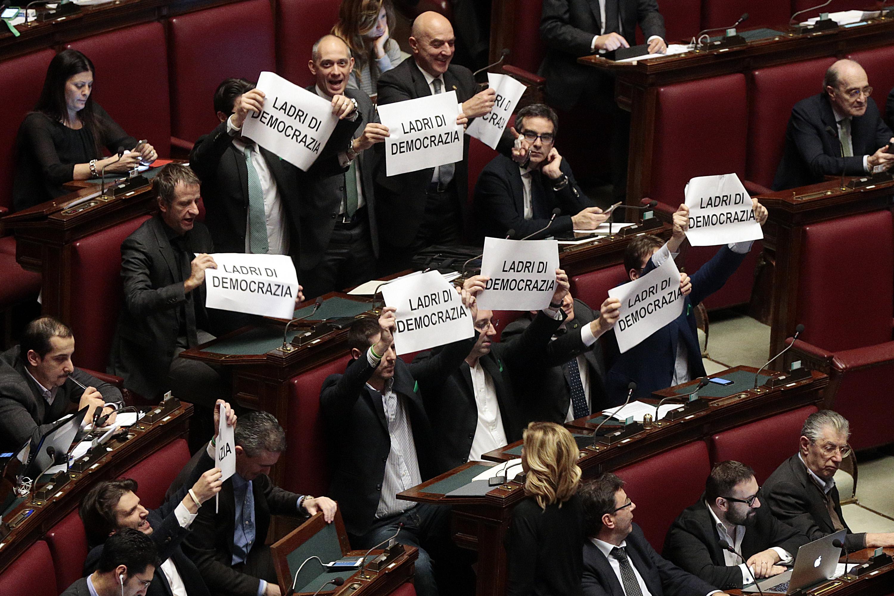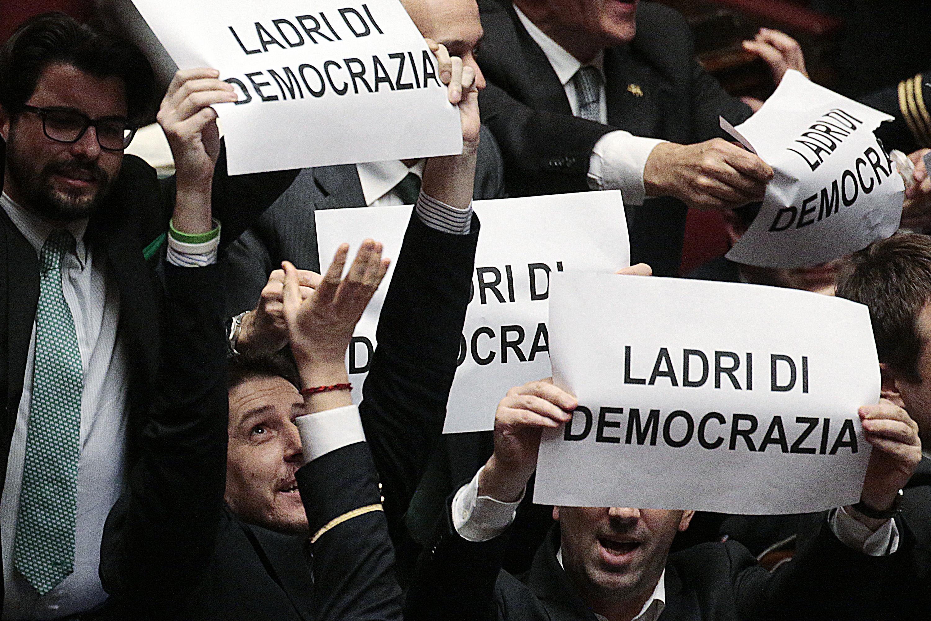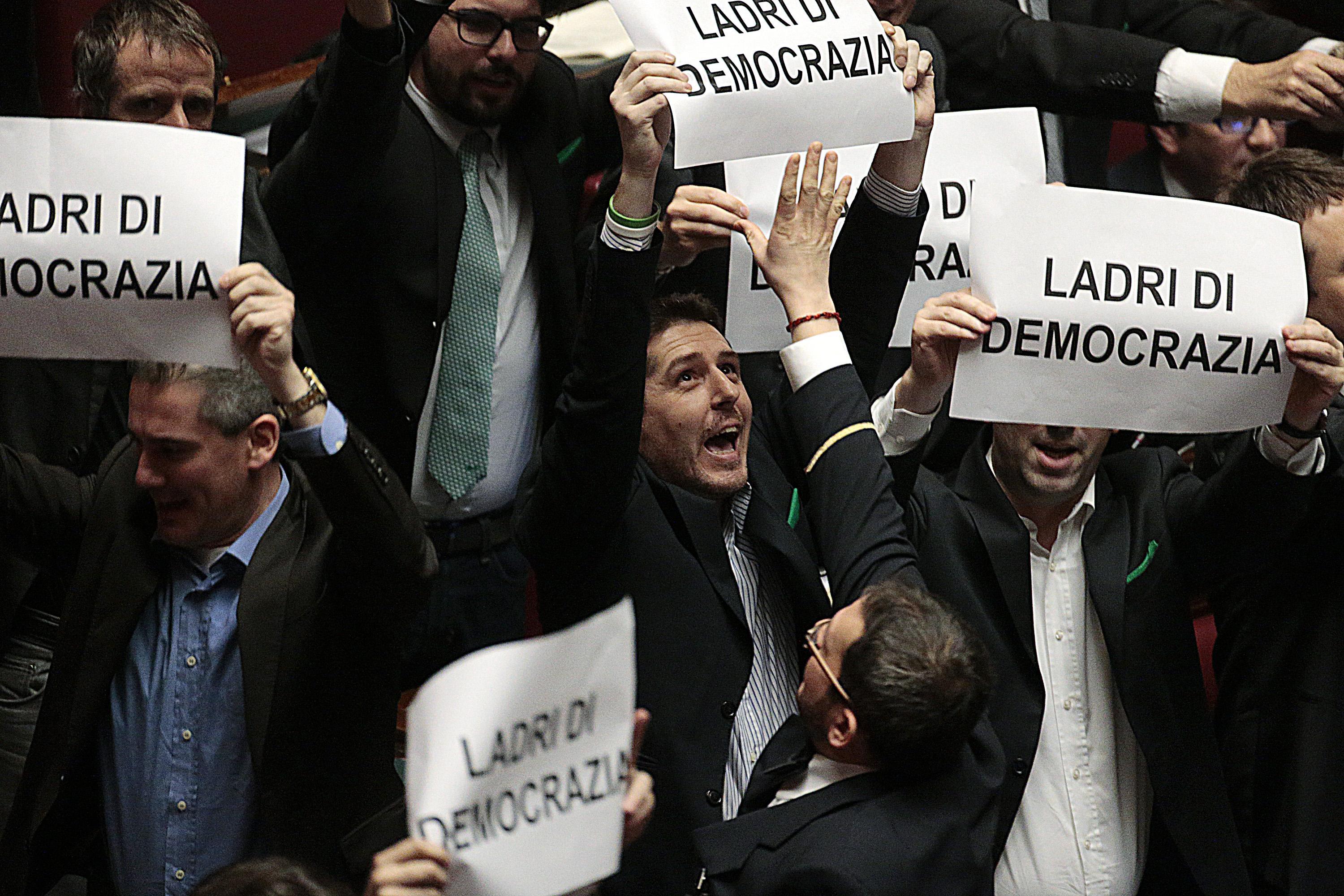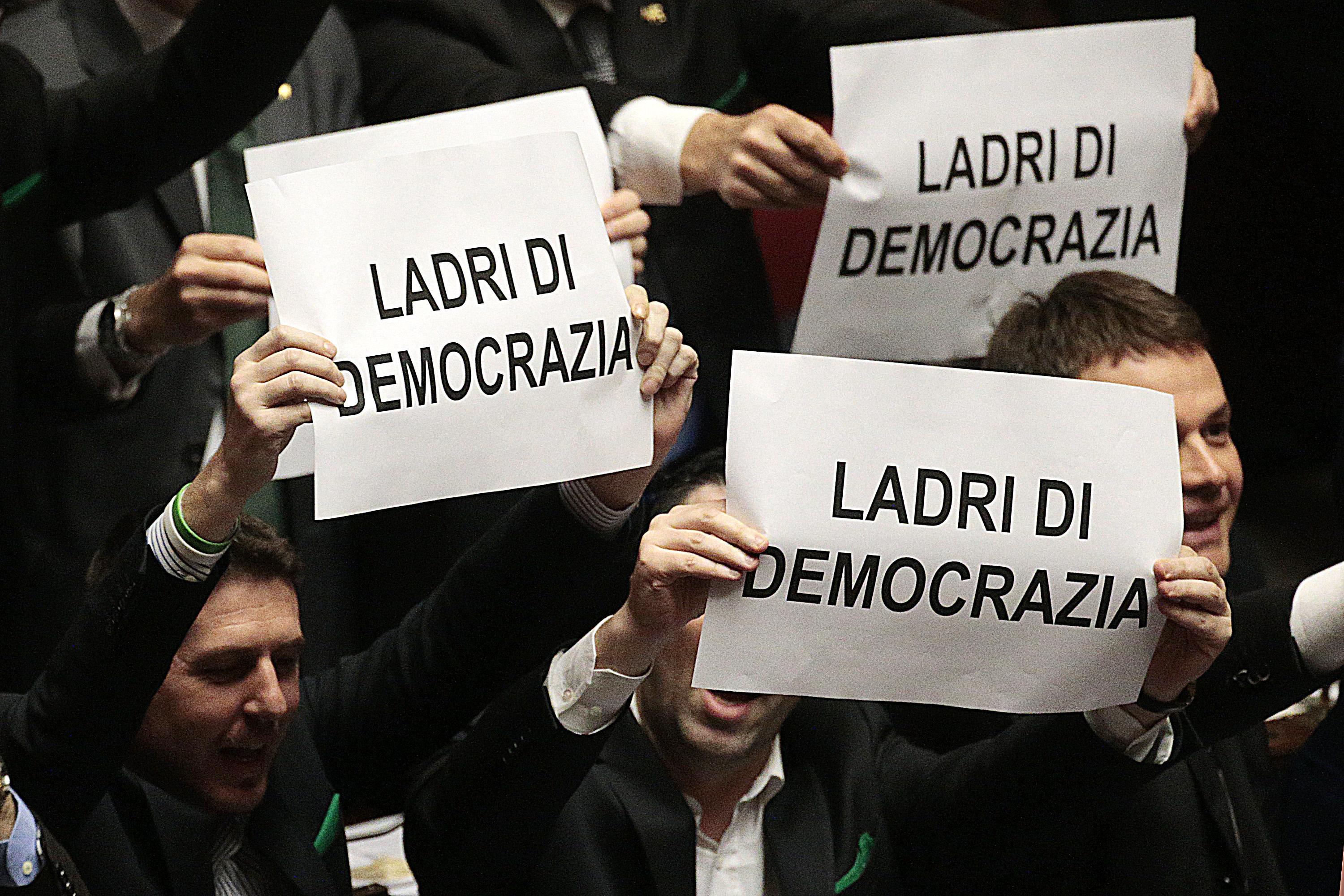 ROMA – Cartelli della Lega nell’Aula della Camera con la scritta “Ladri di democrazia”. Durante l’esame della riforma costituzionale, Massimiliano Fedriga ha urlato “state stuprando la democrazia e non possiamo stare zitti. Da oggi la Lega cambia atteggiamento”. Oggi – ha aggiunto il capogruppo del Carroccio – la democrazia è morta con una sentenza della Consulta che è stata emessa sotto pressione politica per impedire ai cittadini italiani di esprimere liberamente la loro volontà. Noi non staremo zitti”. Il vicepresidente Roberto Giachetti ha “censurato l’attacco alla Corte costituzionale”. La Lega, poco dopo è tornata all’attacco esponendo altri manifesti. “Lavoratori fregati dal Pd” e “Legge Fornero lo Stato contro il popolo”. Le scritte apparse per protestare contro la bocciatura da parte della Consulta del referendum abrogativo della legge Fornero, anche in questo caso sono state subito rimosse dai commessi della Camera (foto Ansa)