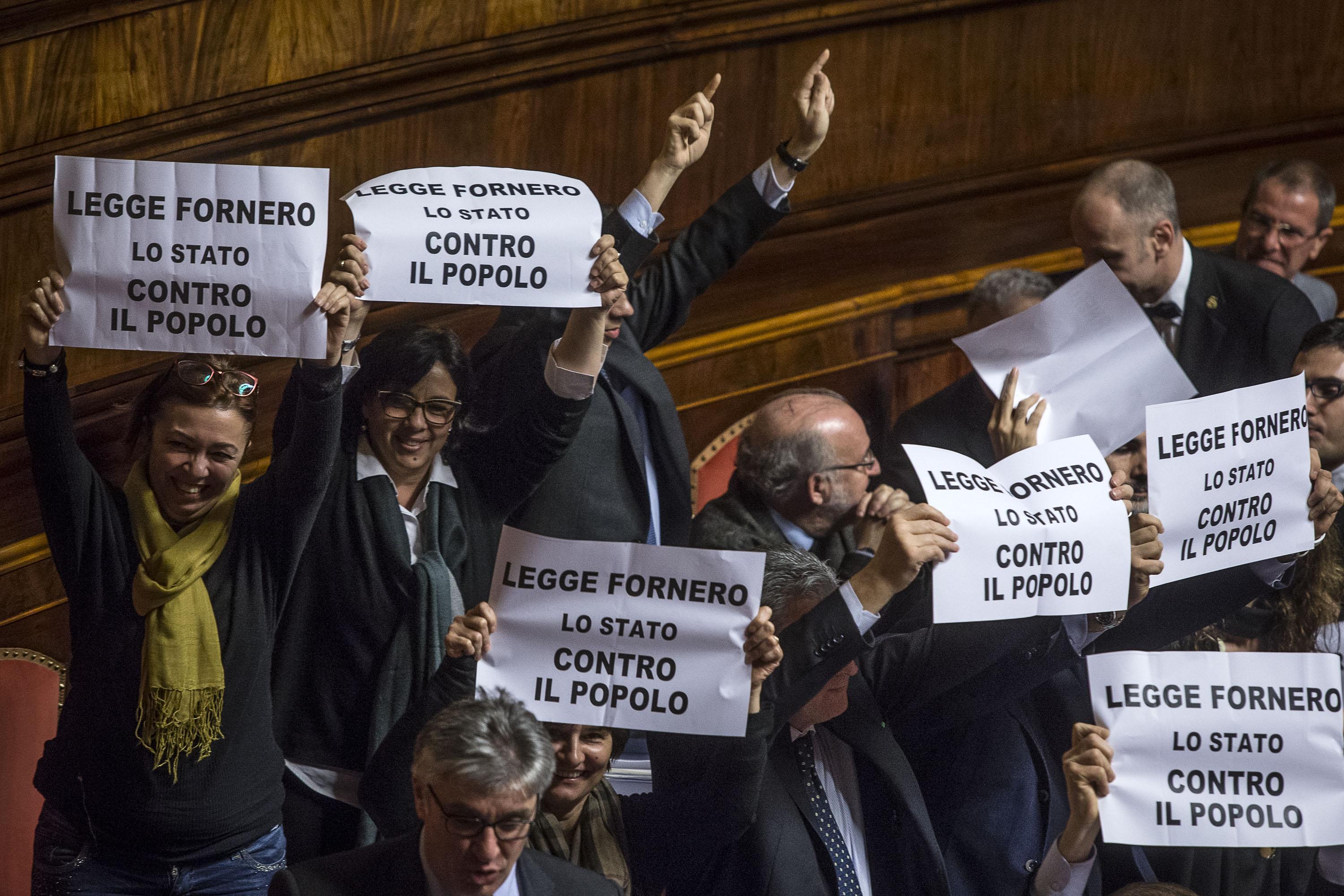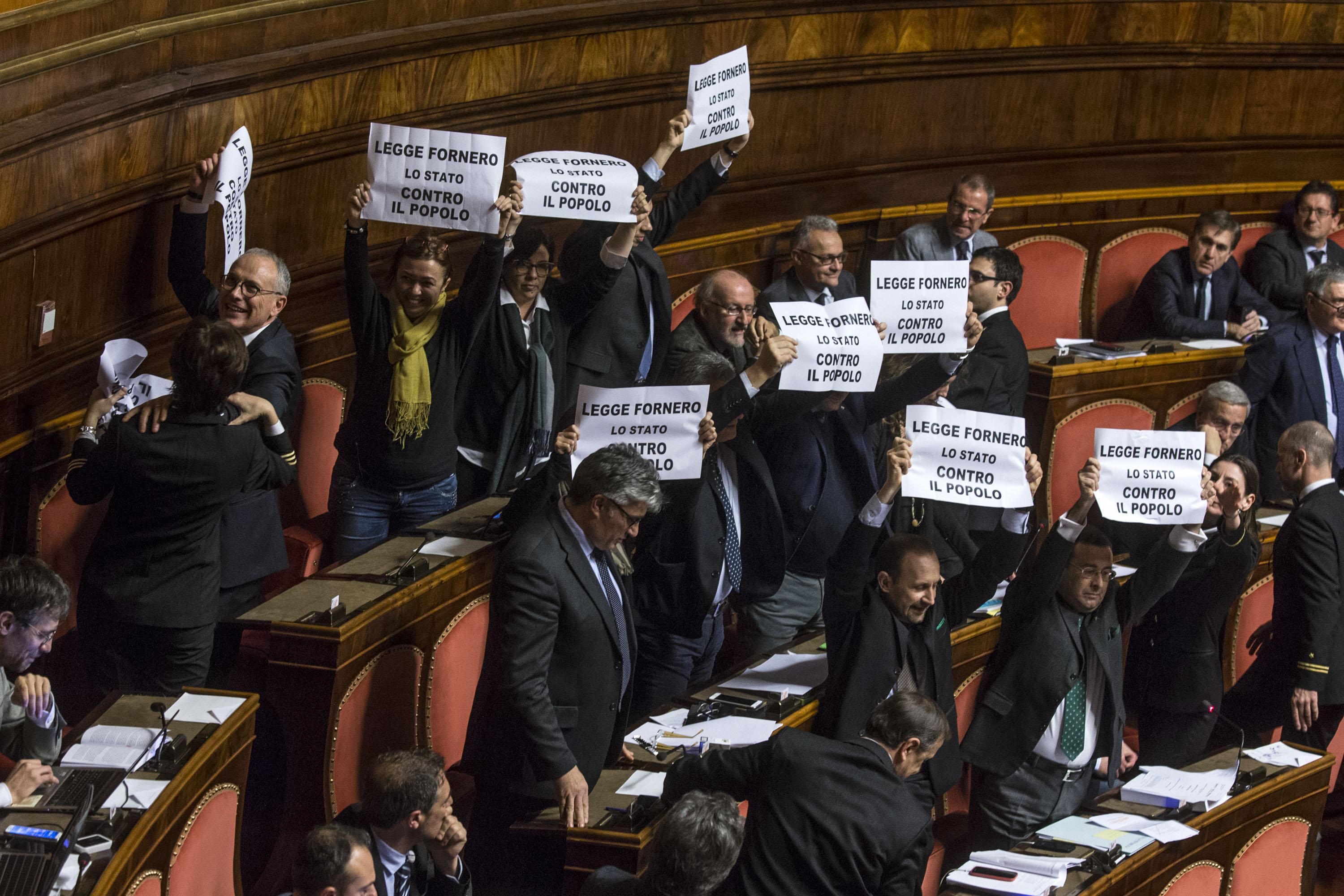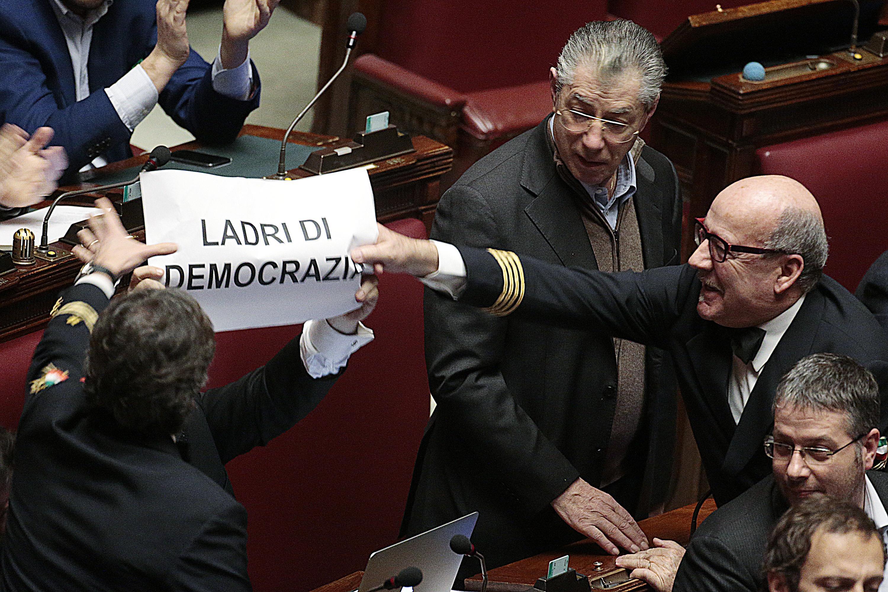 ROMA – Cartelli della Lega nell’Aula della Camera con la scritta “Ladri di democrazia”. Durante l’esame della riforma costituzionale, Massimiliano Fedriga ha urlato “state stuprando la democrazia e non possiamo stare zitti. Da oggi la Lega cambia atteggiamento”. Oggi – ha aggiunto il capogruppo del Carroccio – la democrazia è morta con una sentenza della Consulta che è stata emessa sotto pressione politica per impedire ai cittadini italiani di esprimere liberamente la loro volontà. Noi non staremo zitti”. Il vicepresidente Roberto Giachetti ha “censurato l’attacco alla Corte costituzionale”. La Lega, poco dopo è tornata all’attacco esponendo altri manifesti. “Lavoratori fregati dal Pd” e “Legge Fornero lo Stato contro il popolo”. Le scritte apparse per protestare contro la bocciatura da parte della Consulta del referendum abrogativo della legge Fornero, anche in questo caso sono state subito rimosse dai commessi della Camera (foto Ansa)