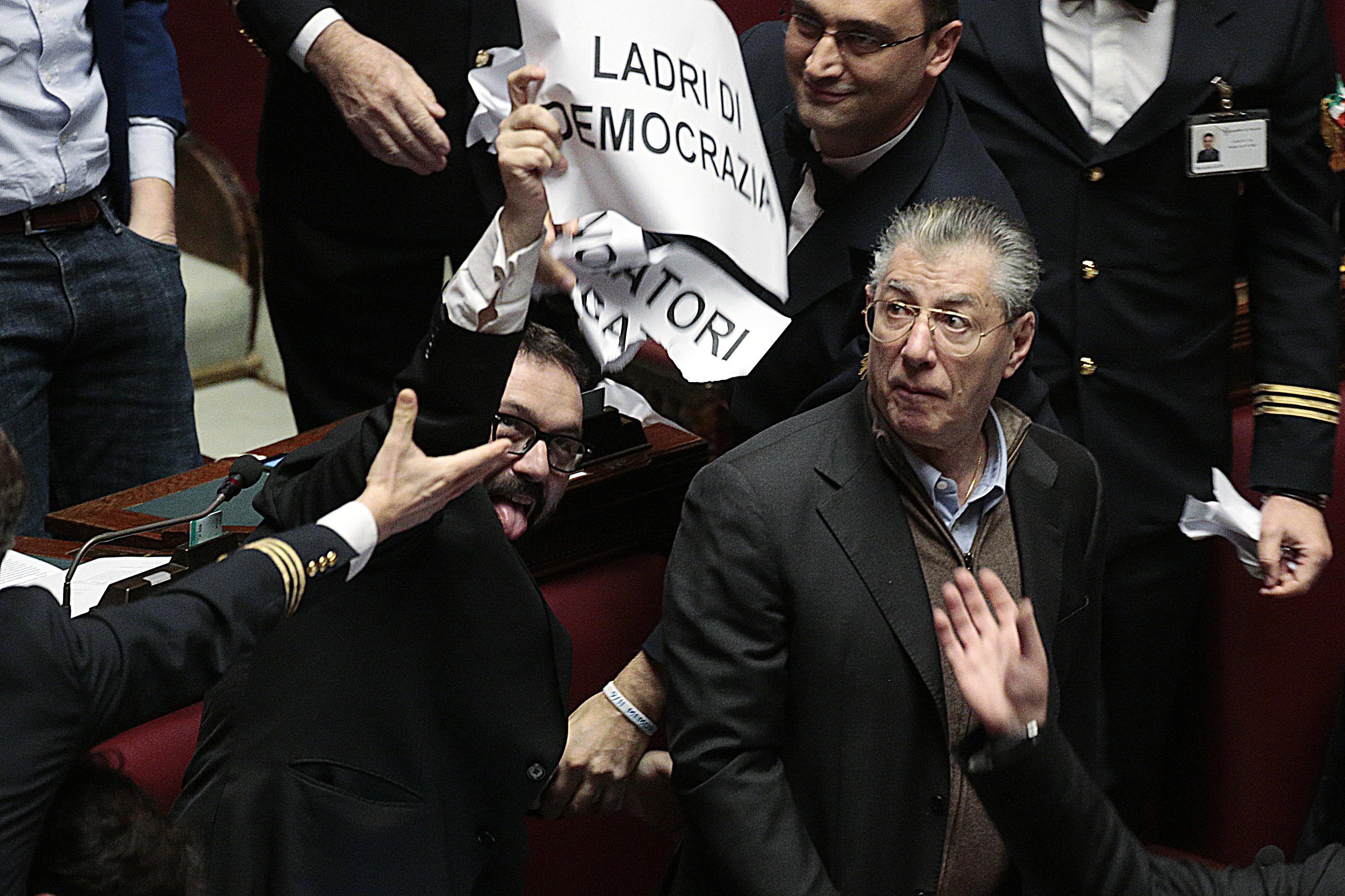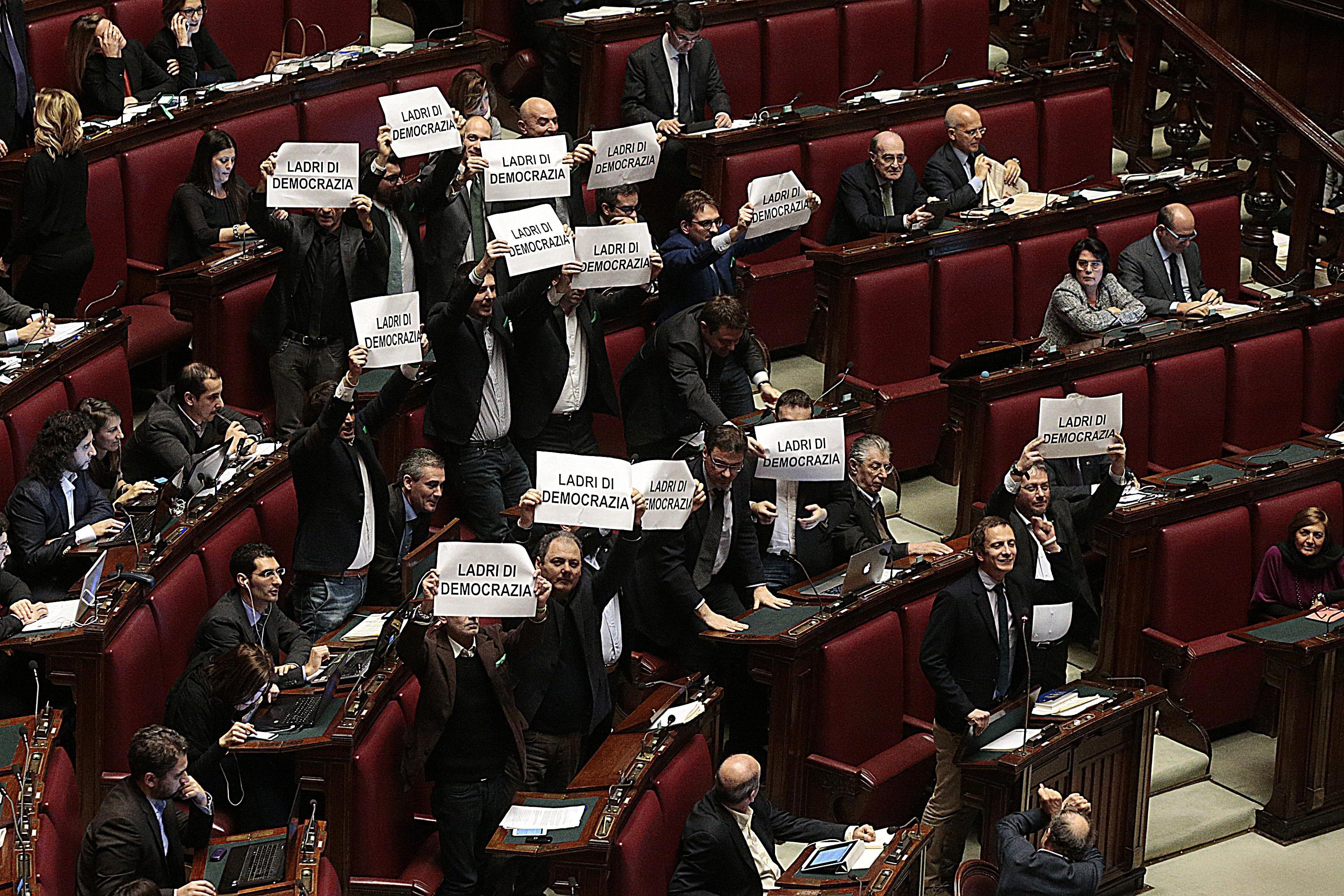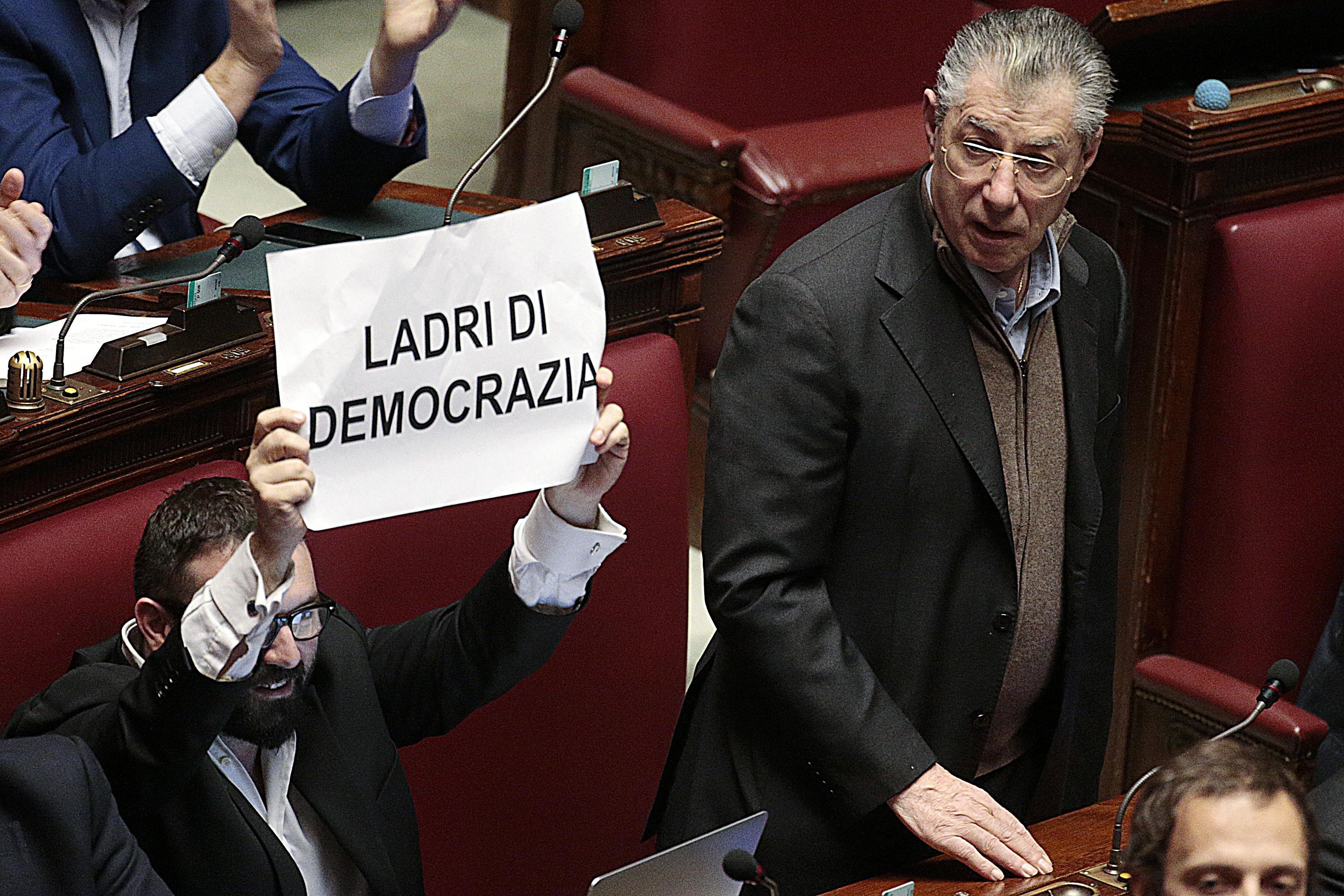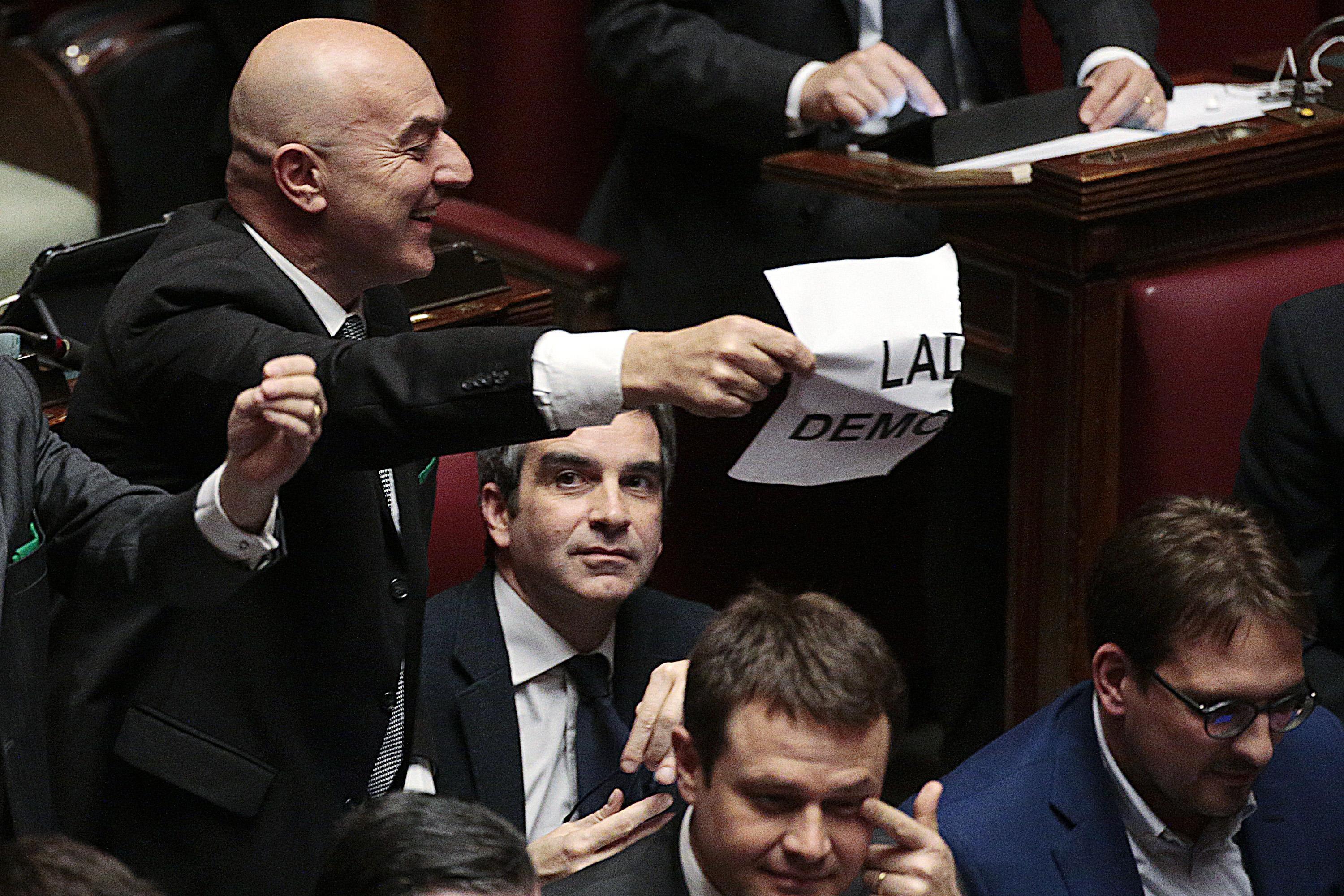ROMA – Cartelli della Lega nell’Aula della Camera con la scritta “Ladri di democrazia”. Durante l’esame della riforma costituzionale, Massimiliano Fedriga ha urlato “state stuprando la democrazia e non possiamo stare zitti. Da oggi la Lega cambia atteggiamento”. Oggi – ha aggiunto il capogruppo del Carroccio – la democrazia è morta con una sentenza della Consulta che è stata emessa sotto pressione politica per impedire ai cittadini italiani di esprimere liberamente la loro volontà. Noi non staremo zitti”. Il vicepresidente Roberto Giachetti ha “censurato l’attacco alla Corte costituzionale”. La Lega, poco dopo è tornata all’attacco esponendo altri manifesti. “Lavoratori fregati dal Pd” e “Legge Fornero lo Stato contro il popolo”. Le scritte apparse per protestare contro la bocciatura da parte della Consulta del referendum abrogativo della legge Fornero, anche in questo caso sono state subito rimosse dai commessi della Camera (foto Ansa)