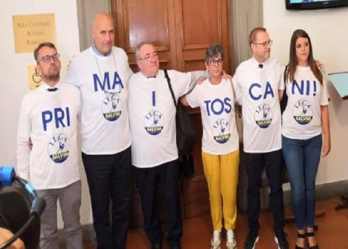 La scritta è impressa sopra il simbolo della Lega, sulle magliette dei consiglieri Elisa Montemagni, Luciana Bartolini, Roberto Salvini, Jacopo Alberti, Roberto Biasci e Marco Casucci.