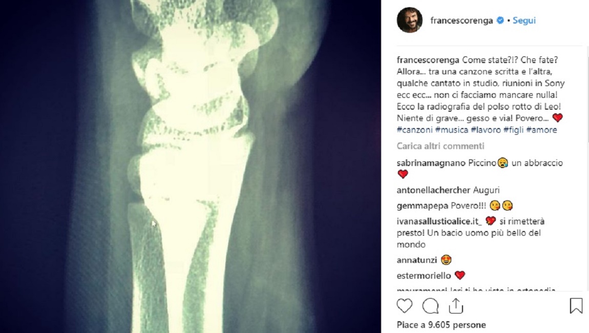 Renga, che in questi giorni è impegnato nelle registrazioni del suo nuovo album, l’ha buttata lì, camuffando un po’ la notizia: “Come state?- ha scritto su Instagram – Che fate? Tra una canzone scritta e l’altra, qualche cantato in studio, riunioni Sony ecc ecc.. non ci facciamo mancare nulla! Ecco la radiografia del polso rotto di Leo!“. Poi però ha subito rassicurato i fan: “Niente di grave.. gesso e via! Povero…”.