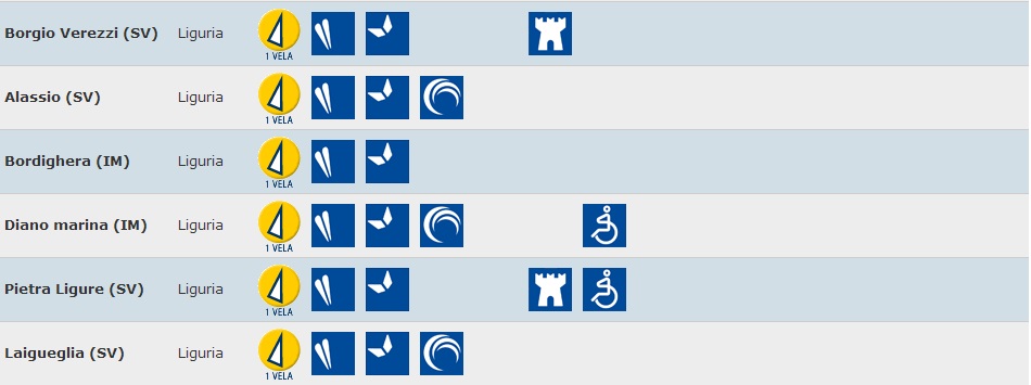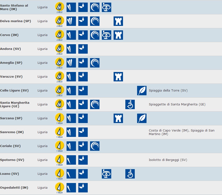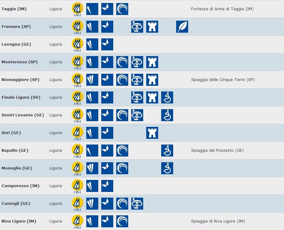 Seguono Noli, Levanto, Bergeggi, Portofino e Portovenere con quattro vele su cinque. In classifica anche la Spiaggia di Punta Corvo (Lerici), la Fortezza di Arma di Taggia (Imperia), la Spiaggia delle Cinque Terre (La Spezia) e anche la Spiaggia del Pozzetto (Genova).