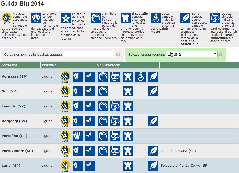 La classifica Guida Blu è stilata ogni anno da Legambiente: le spiagge vengono classificate a seconda delle “vele blu” assegnate alle località esaminate: 5 vele è il massimo del riconoscimento.