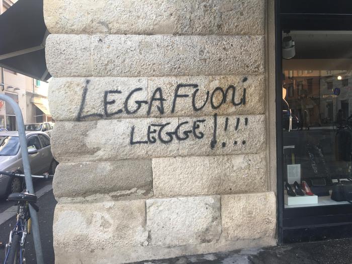 LIVORNO – La scritta ‘Lega fuorilegge’, ripetuta quattro volte e tracciata con vernice nera, è comparsa la mattina di oggi, sabato 3 novembre, sulla facciata di un palazzo di Livorno, in piazza Cavour. E’ il luogo dove nel pomeriggio è prevista l’inaugurazione della sede cittadina della Lega alla presenza della commissario toscano del partito di Salvini, il sindaco di Cascina (Pisa) Susanna Ceccardi.