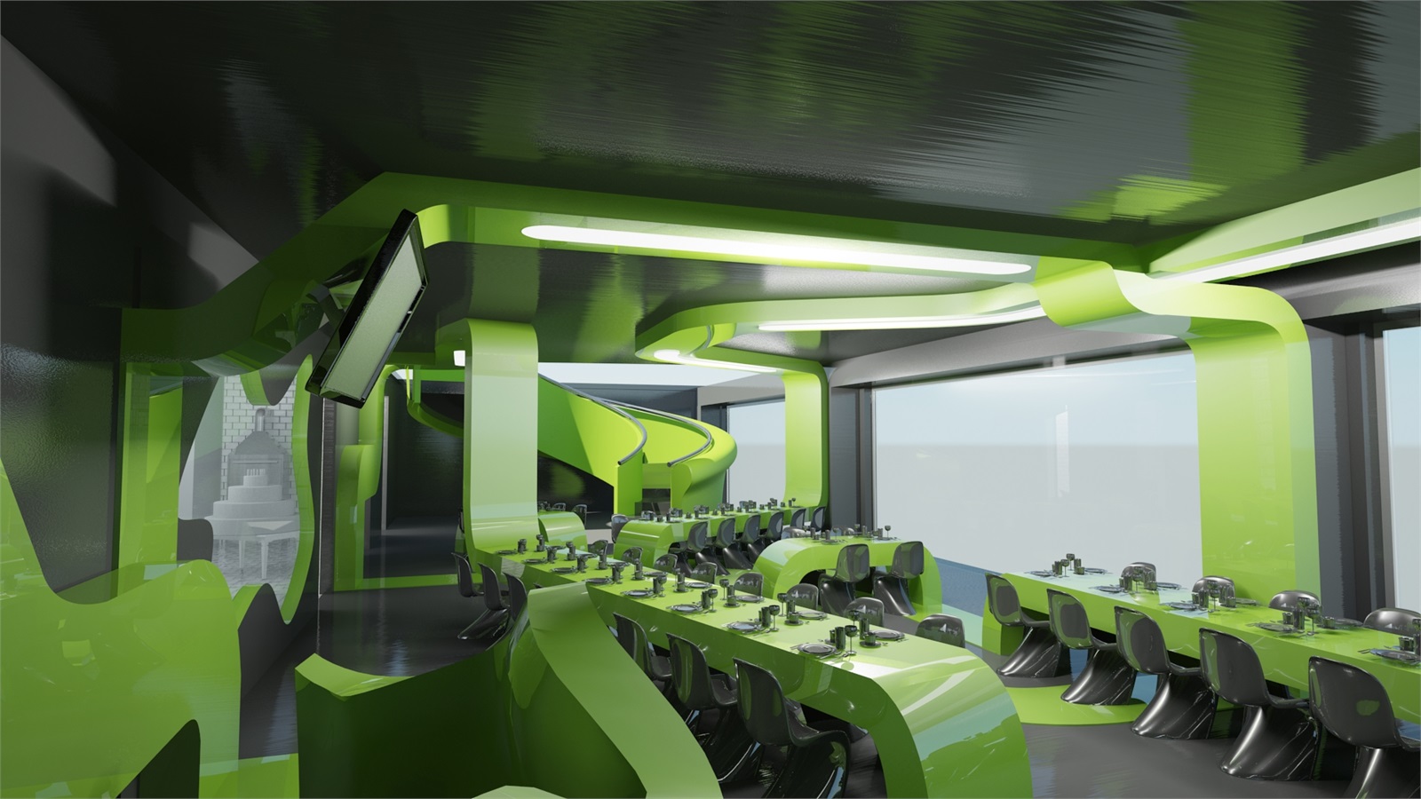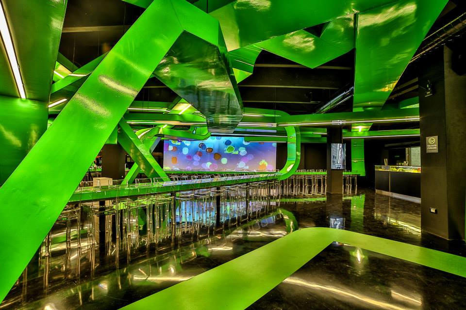 Gli interni sono concepiti come un grande cervello, con sinapsi di colore verde acido su fondo nero. E poi schermi e monitor che raccontano il disagio della tossicodipendenza.