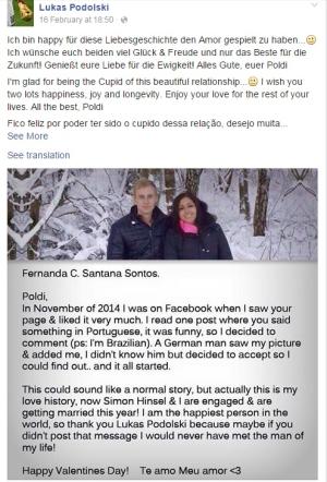 La risposta di Podolski, incredulo, non si è fatta attendere ed ecco gli auguri ai due innamorati: “Sono contento di essere stato il Cupido di questa bella relazione. Vi auguro tanta felicità e gioia. Godetevi questo amore per il resto della vostra vita”.
