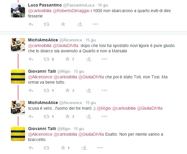 Vai Rosaaaaaaaa! Viva Quarto! Da quello in Liguria sbarcarono i mille 😉 Sarà profetico?”.