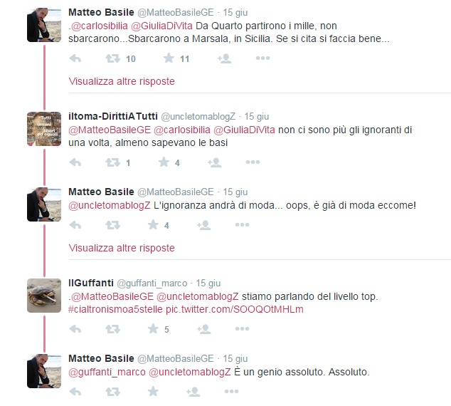 ROMA – “I Mille sbarcarono a Quarto“. Questa la gaffe del deputato del Movimento 5 stelle Carlo Sibilia su Twitter. Una gaffe che gli utenti non gli hanno perdonato, attaccandolo a colpi di cinguettii e ricordandogli che lo sbarco dei Mille non avvenne a Quarto, ma a Marsala.