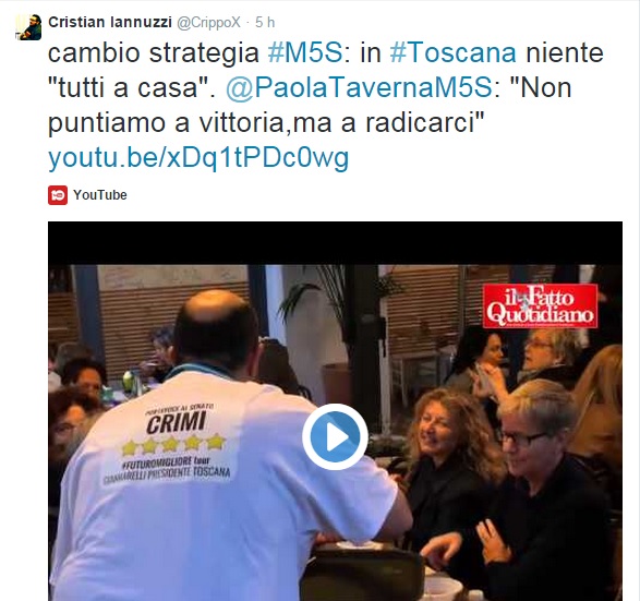 Tutto inizia quando Iannuzzi, eletto con M5s insieme alla madre Ivana Simeoni, ha attaccato la Taverna per un video alla campagna elettorale in Toscana. La Taverna dice che M5s non punta alla vittoria ma a radicarsi nel territorio.ย L’ex M5s poi ha aggiunto:”Ma non vale il tutti a casa?”.