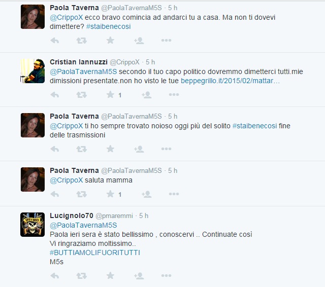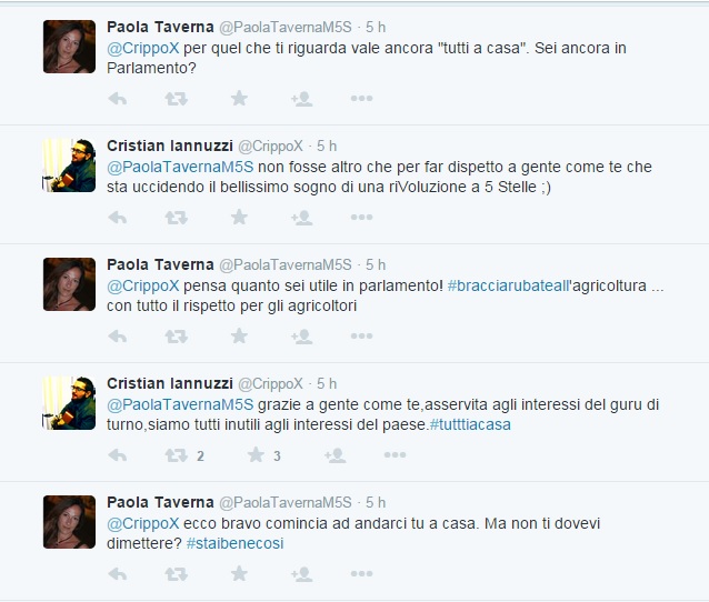 ROMA – Un botta e risposta serrato su Twitter รจ iniziato il 21 maggio tra Paola Taverna, senatrice del Movimento 5 stelle, e Cristian Iannuzi, ex M5s. Iannuzzi ha postato un filmato della Taverna in cui spiega che M5s vuole “radicarsi” nella regione Toscana e ha commentato: “Non volevate tutti a casa?”. La risposta piccata della Taverna non si รจ fatta attendere.