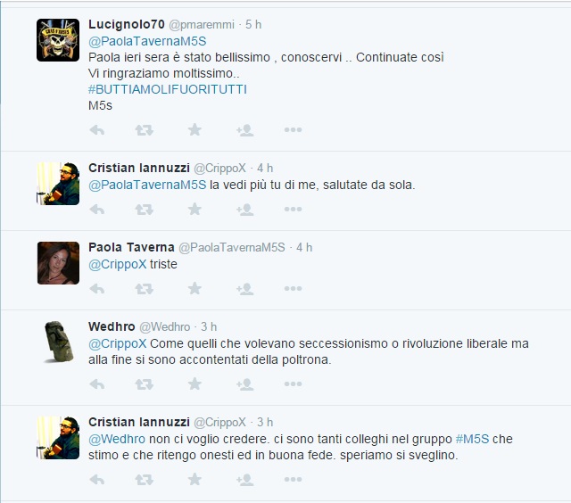 “Fosse altro per far dispetto a gente come te – replica il deputato – che sta uccidendo il bellissimo sogno di una riVoluzione a 5 Stelle”.