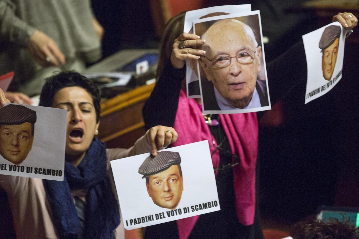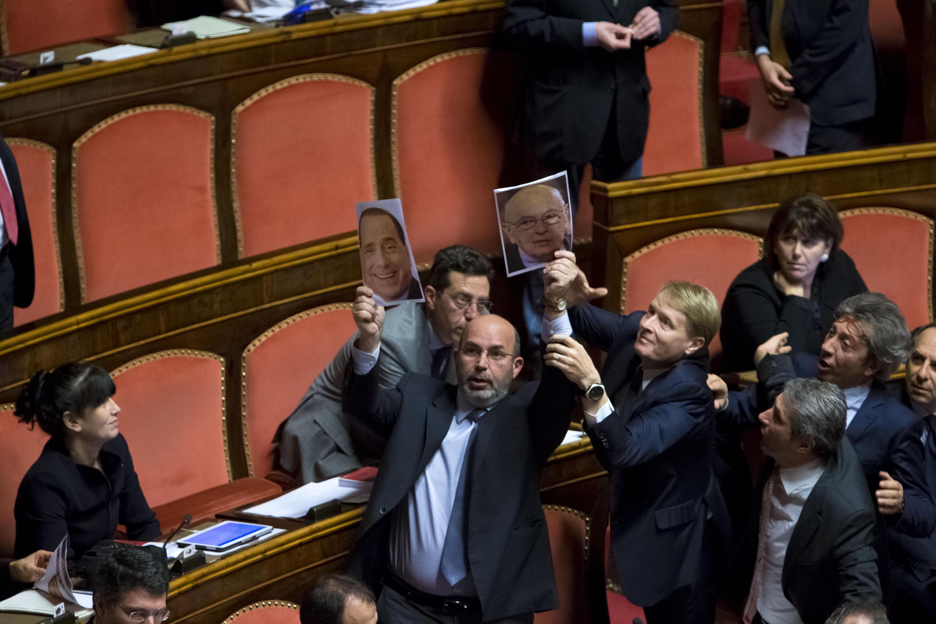 ROMA – Durante il voto al Senato dell’esame del ddl sul voto di scambio politico-mafioso, nel corso delle dichiarazioni di voto si è creato subito un clima incandescente: protagonisti, da un lato, i parlamentari 5 Stelle e dall’altro, i parlamentari di tutti gli altri schieramenti. Il presidente Piero Grasso ha richiamato diverse volte all’ordine i parlamentari, invitando in particolare i 5 Stelle a “permettere ai colleghi di parlare liberamente”. Dai banchi dei grillini però, sono state esposte fotografie che accostavano Silvio Berlusconi e il Presidente della Repubblica Giorgio Napolitano. A questo punto, il presidente del Senato ha sospeso la seduta.