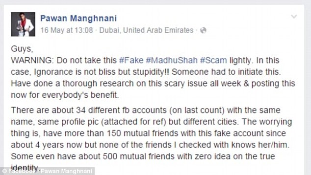 Se doveste malauguratamente scoprire di essere anche voi amici di Madhu Shah, non è dato sapere a quale rischio siete stati esposti. Secondo Pawan la cosa migliore da fare è segnalare quel nome a Facebook, taggare gli amici che sono amici di Madhu Shah e avvertirli che quell’account è un fake.
