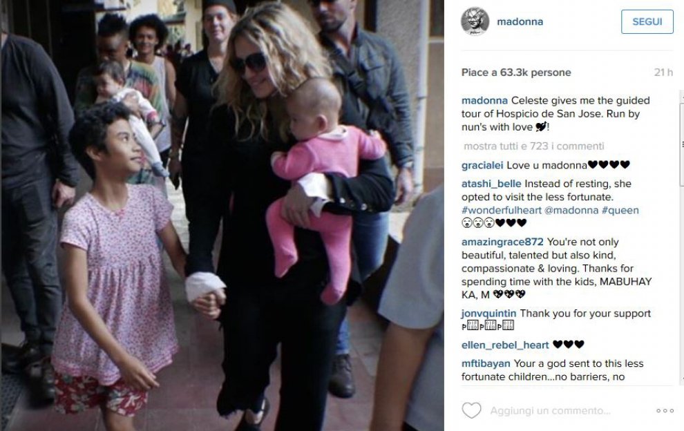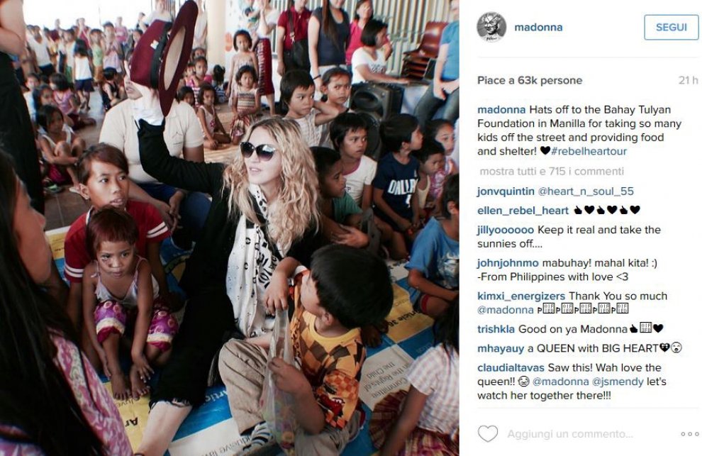 Madonna si è presa una pausa dalle prove del concerto e ha visitato l’orfanotrofio San Josè, come testimoniano diversi suoi selfie con i bambini postati su Instagram accompagnati da frasi che ricordano “siamo fortunati” e testimoniano che molti di quei piccoli sono non solo stati abbandonati, ma spesso sfruttati, abusati e resi vittime del traffico di minori.