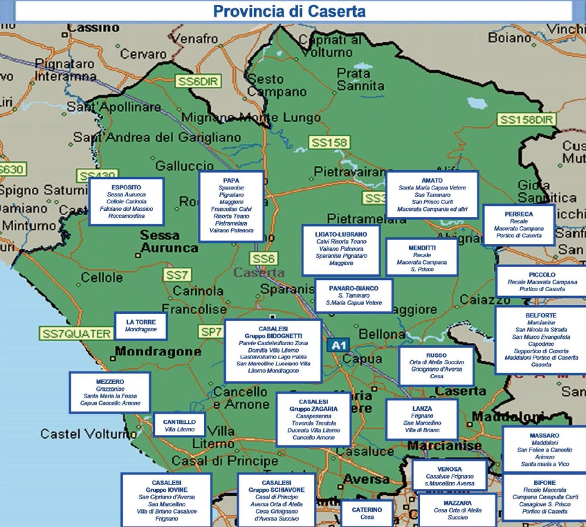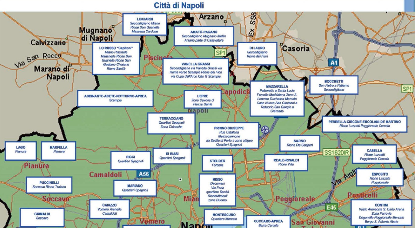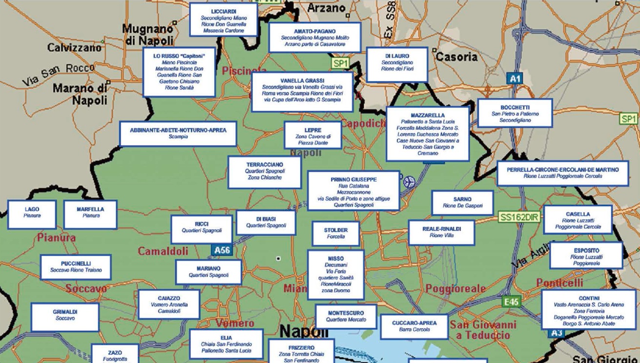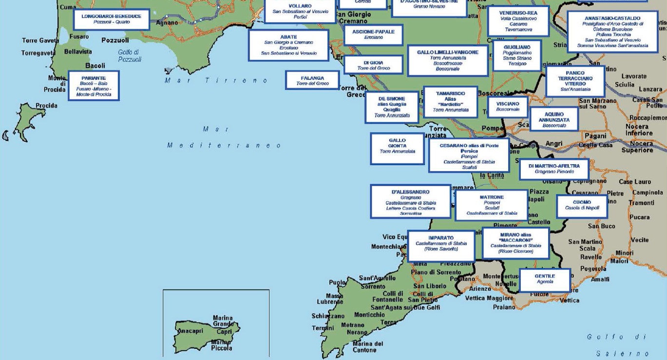 Di seguito la mappa dei principali gruppi criminali che operano in Campania, Calabria e Sicilia.