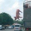 FOSHAN (CINA) – E’ una rocambolesca fuga, quella tentata da un maialino che è riuscito prima a scavalcare e liberarsi da una gabbia e poi si è lanciato dal camion in corsa raggiungendo, illeso, l’asfalto. Ma quando ormai la fuga sembrava completata il camionista, dopo aver visto dallo specchietto il maialino volare per terra, è tornato indietro e ha caricato di nuovo il coraggioso e ribelle animale nella gabbia.