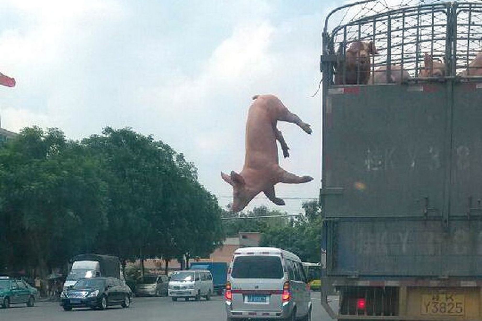 FOSHAN (CINA) – E’ una rocambolesca fuga, quella tentata da un maialino che è riuscito prima a scavalcare e liberarsi da una gabbia e poi si è lanciato dal camion in corsa raggiungendo, illeso, l’asfalto. Ma quando ormai la fuga sembrava completata il camionista, dopo aver visto dallo specchietto il maialino volare per terra, è tornato indietro e ha caricato di nuovo il coraggioso e ribelle animale nella gabbia.
