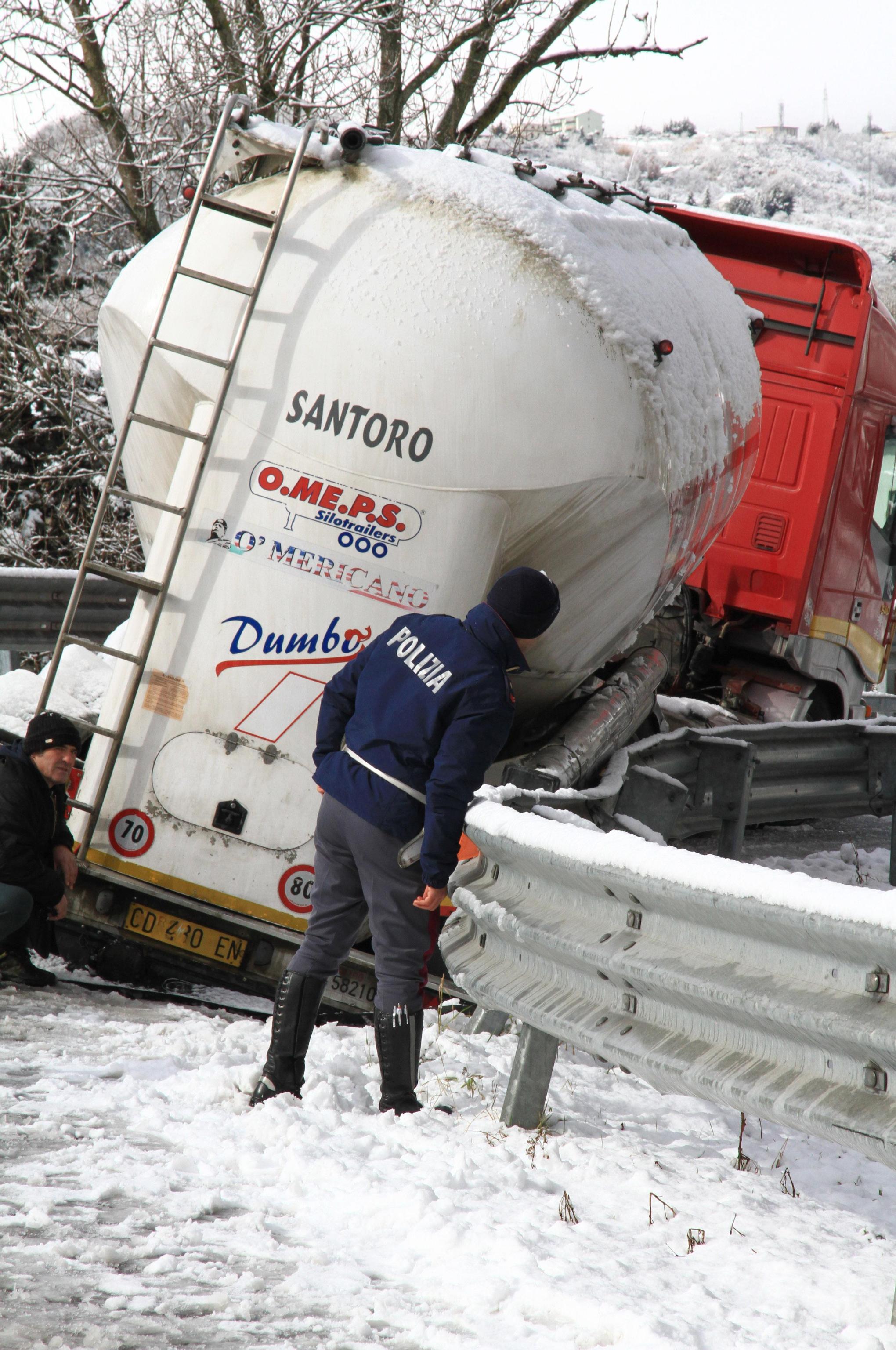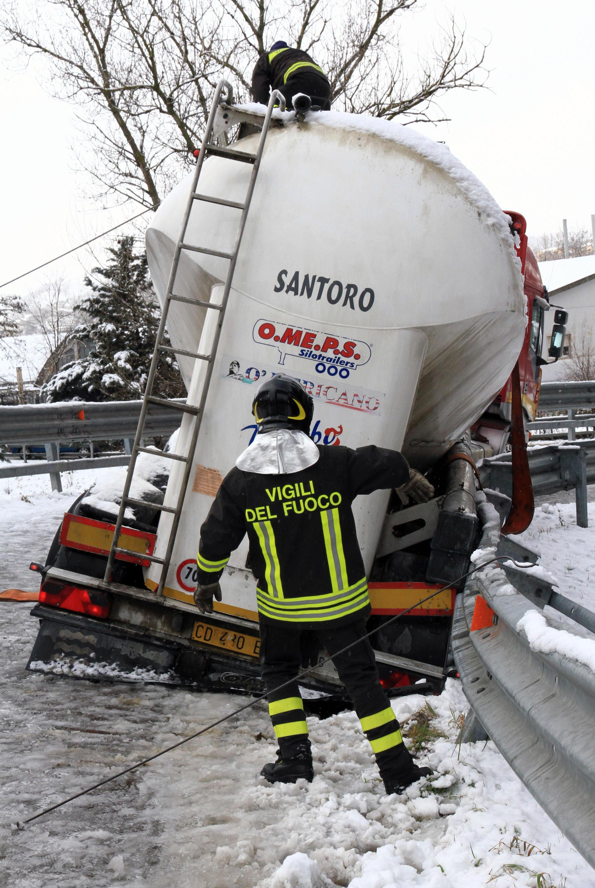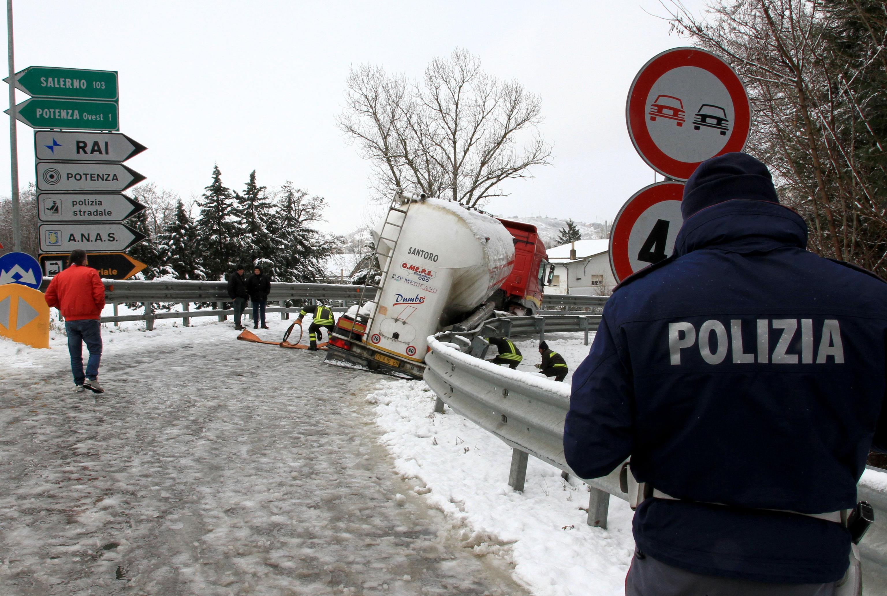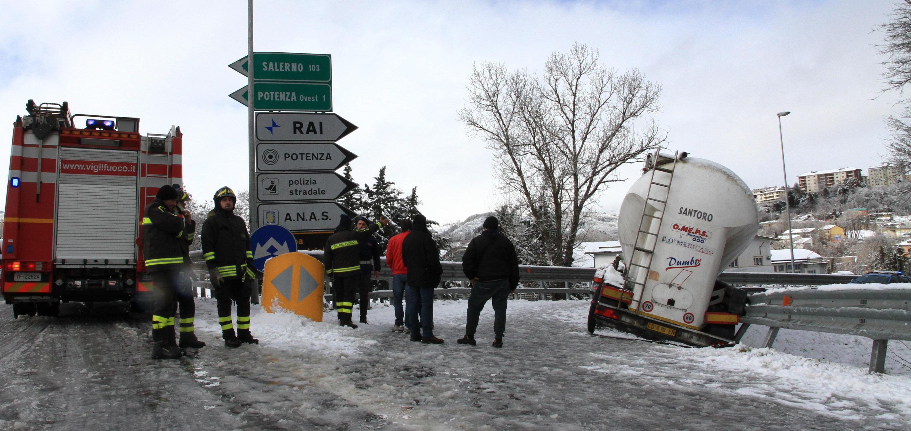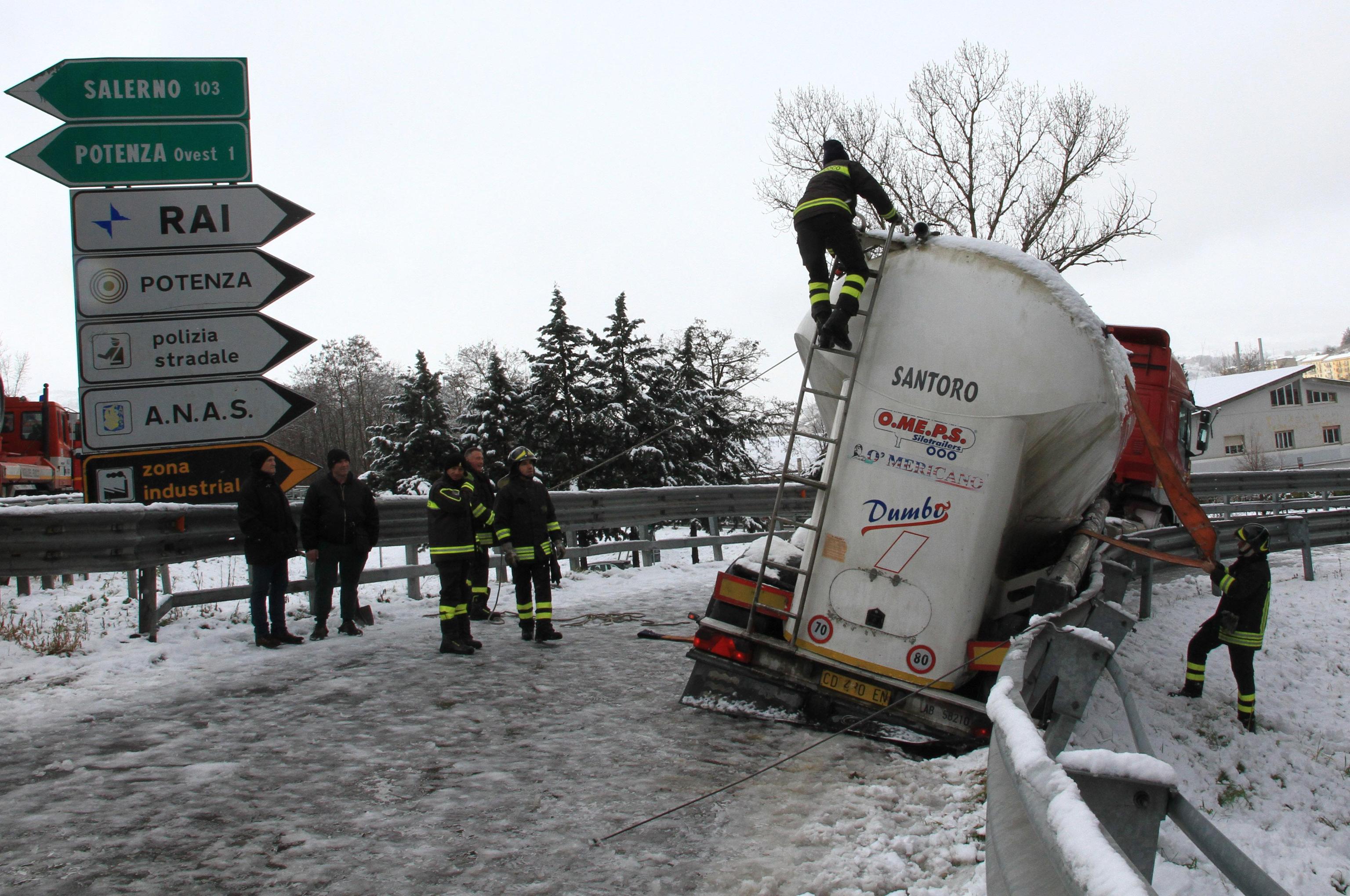In Basilicata, da alcune ore sta cadendo molta neve che sta creando rallentamenti alla circolazione automobilistica. Anche se tutte le principali arterie della regione risultano percorribili, il sindaco di Potenza Dario De Luca ha disposto la chiusura delle scuole di ogni ordine e grado. Le scuole resteranno chiuse oggi 2 febbraio anche in altri Comuni del Potentino, dove nei giorni scorsi sono stati registrati disagi soprattutto per la pioggia insistente che ha creato interruzioni di alcune strade provinciali. Le foto della cisterna ribaltata (foto Ansa).