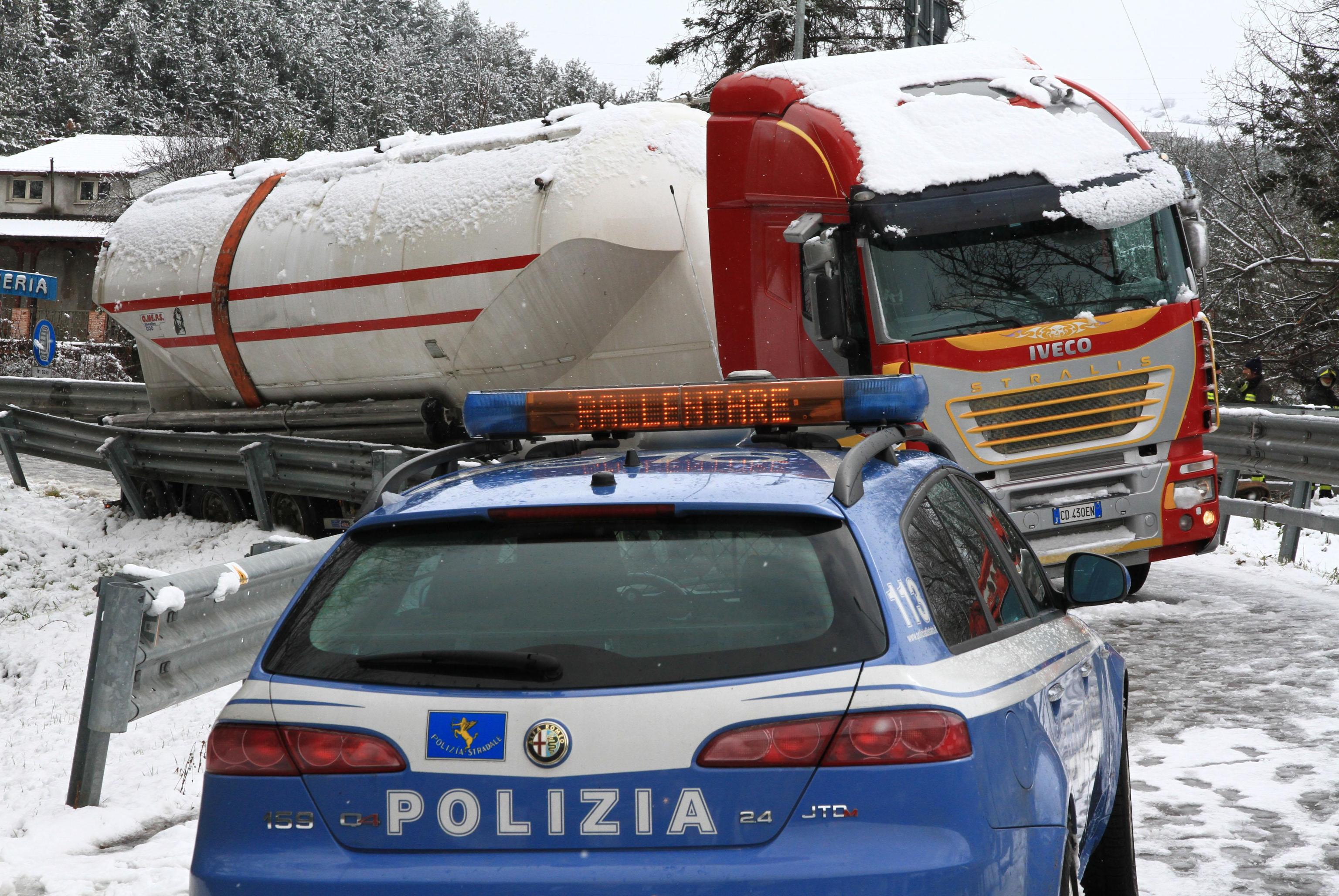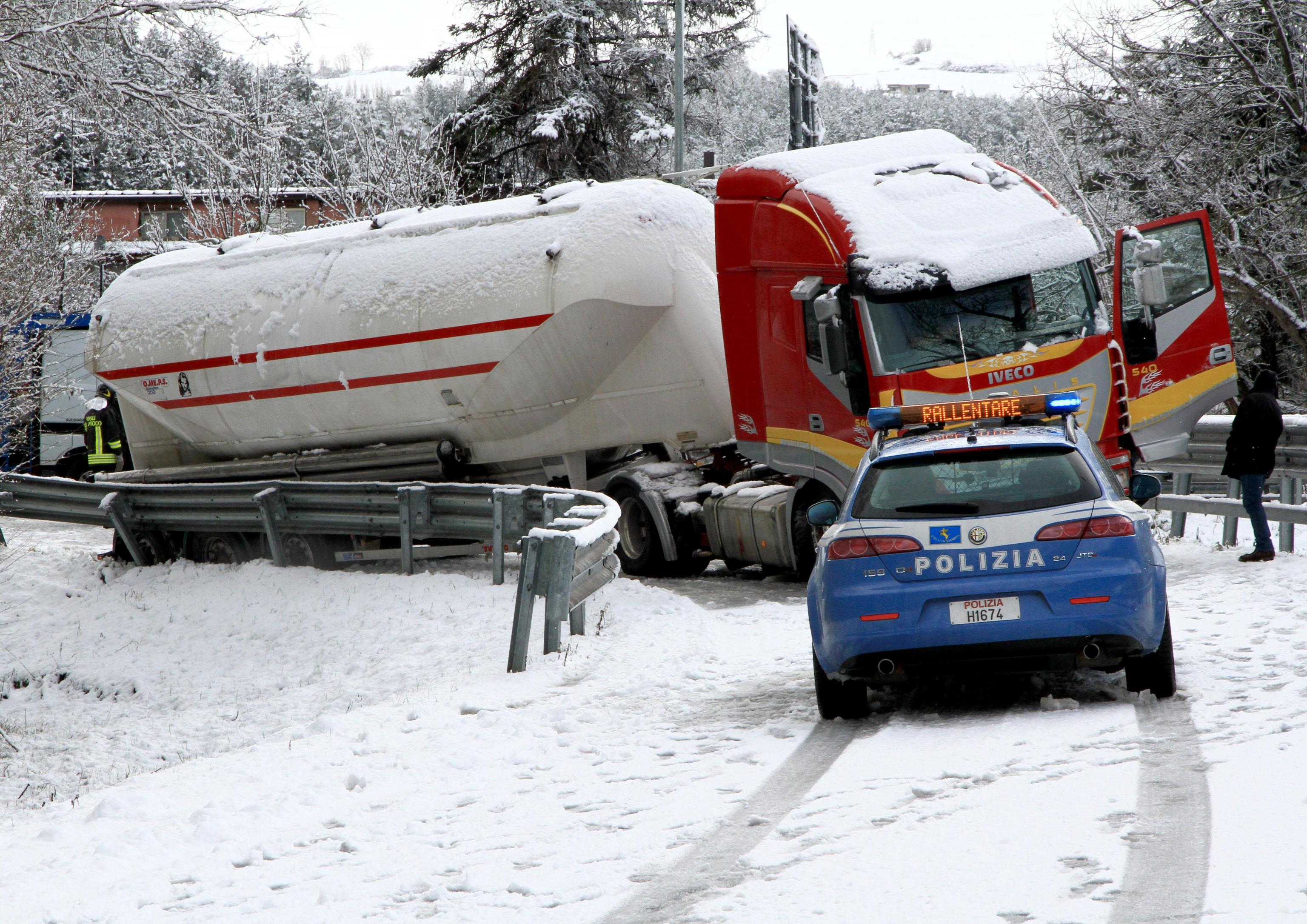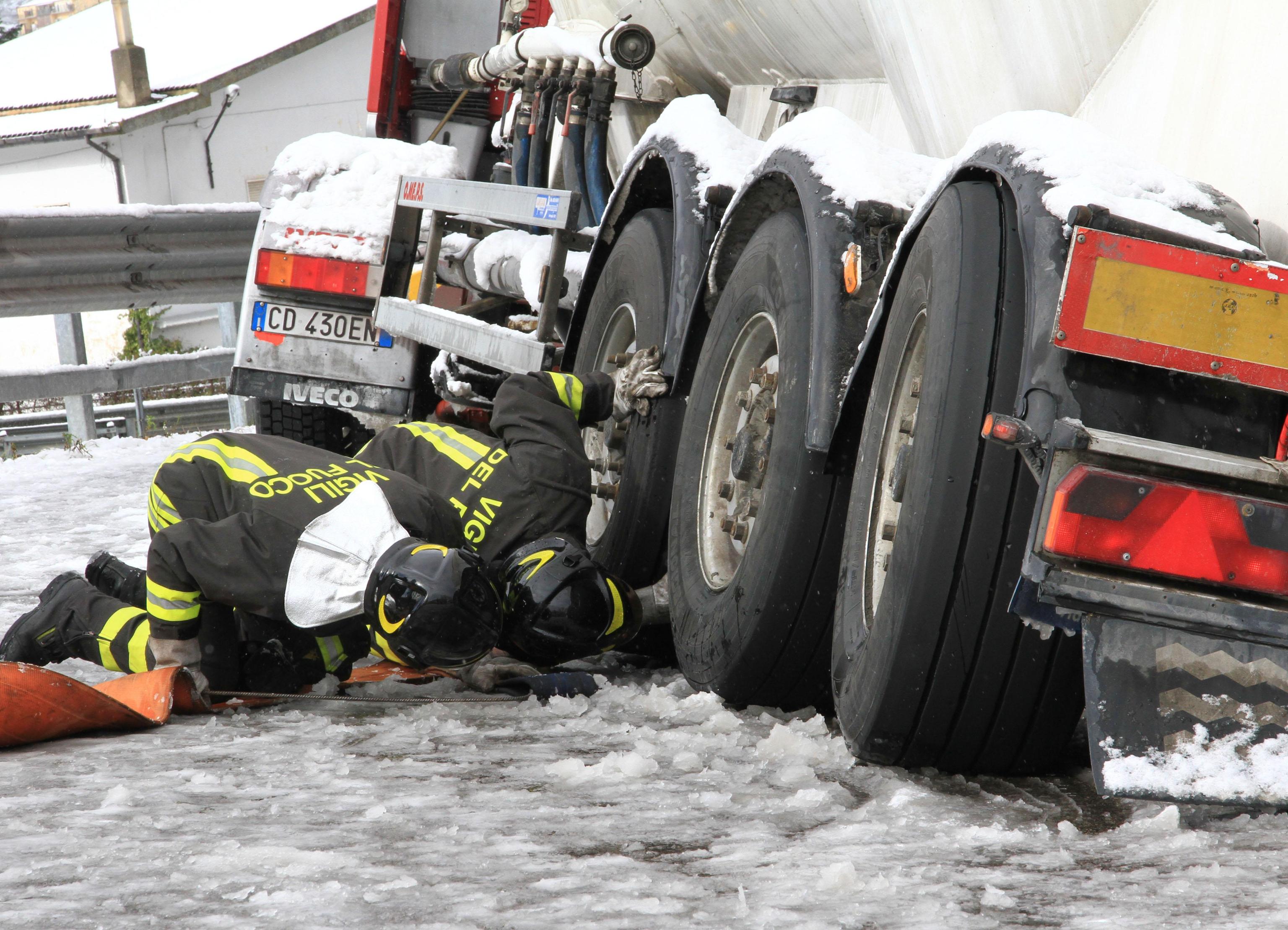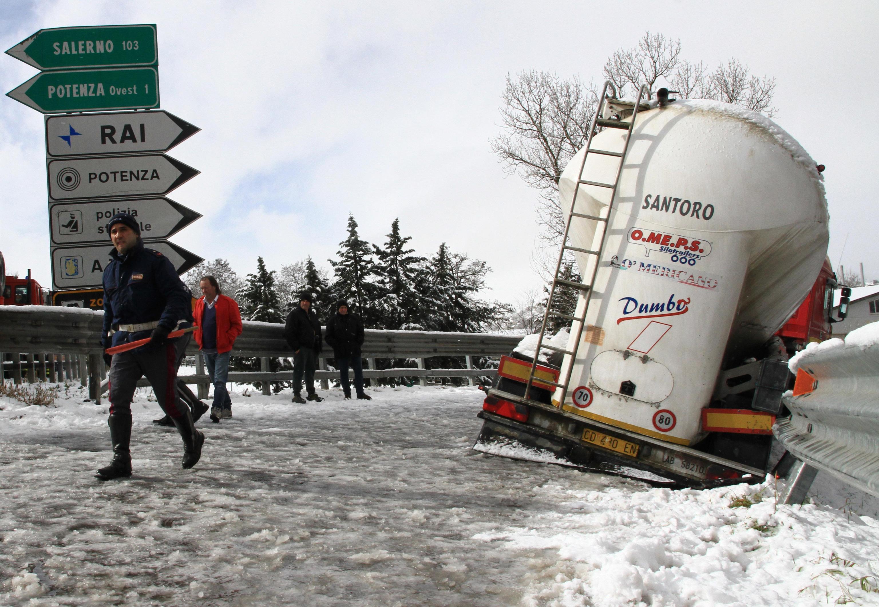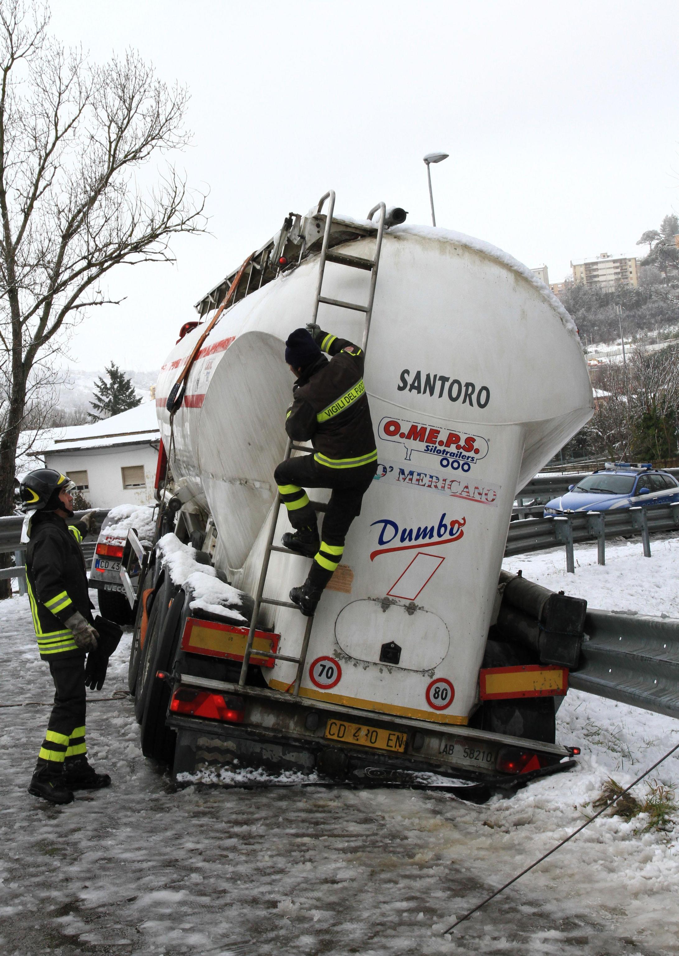 In Basilicata, da alcune ore sta cadendo molta neve che sta creando rallentamenti alla circolazione automobilistica. Anche se tutte le principali arterie della regione risultano percorribili, il sindaco di Potenza Dario De Luca ha disposto la chiusura delle scuole di ogni ordine e grado. Le scuole resteranno chiuse oggi 2 febbraio anche in altri Comuni del Potentino, dove nei giorni scorsi sono stati registrati disagi soprattutto per la pioggia insistente che ha creato interruzioni di alcune strade provinciali. Le foto della cisterna ribaltata (foto Ansa).