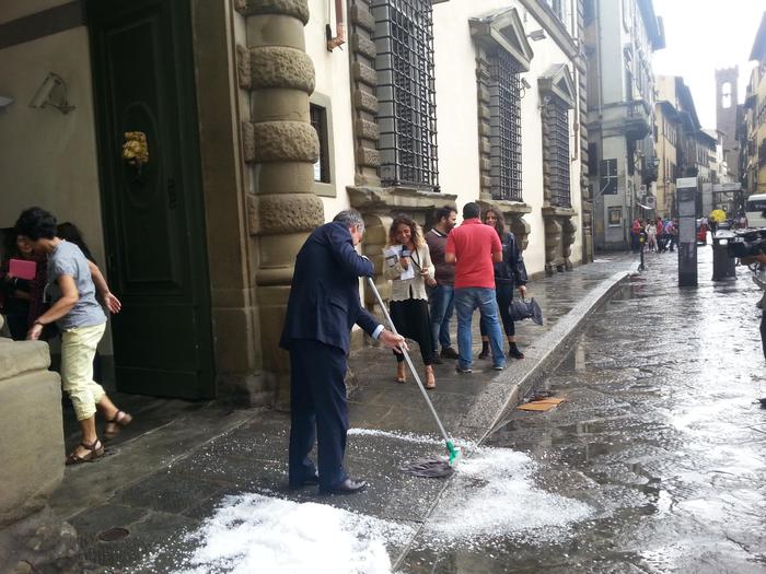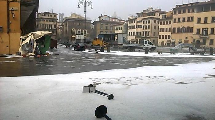 Il fiume, che pure aspetta di essere ancora messo in piena sicurezza, non c’entra. Poco dopo mezzogiorno il cielo si è fatto improvvisamente scuro e in dieci minuti la città si è imbiancata per la grandine mentre il vento spazzava tutto ciò che trovava sulla sua strada. Molti hanno dovuto spalare la coltre bianca, proprio come si fa con la neve. Tra loro anche il Governatore della Toscana Enrico Rossi, impegnato davanti all’ingresso della Regione, in piazza del Duomo. Alcuni musei sono stati chiusi, come gli Uffizi, e riaperti solo dopo le verifiche, anche se la conta dei danni darà possibile solo domani. Nella prossima seduta, ha annunciato Rossi, la giunta regionale approverà la richiesta dello stato di calamità. “La Regione – ha detto il presidente – farà la sua parte, ma ci auguriamo che anche lo stato vorrà intervenire in favore delle popolazioni così duramente colpite. I turisti, sorpresi nel centro storico, cercavano inutilmente riparo nei negozi: molte strade si sono trasformate in torrenti e dai tetti venivano giù tegole e, in alcuni casi, pezzi di grondaie che non reggevano la forza dell’acqua.