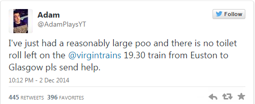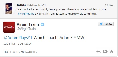 Il ragazzo scrive in tempo reale di “aver fatto una grossa cacca” e di non aver trovato la carta nel bagno. Virgin gli chiede di verificare il numero di treno e poco dopo manda un addetto che consegna un rotolo al ragazzo. Adam apre la porta giusto il tempo di ricevere la carta igienica poi, dopo uno scambio di sguardi imbarazzati con l’addetto, finisce di fare quello che deve fare.