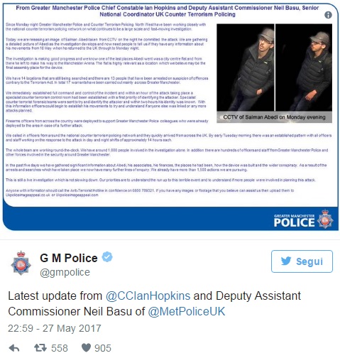 Il capo della polizia di Manchester, Ian Hopkins e Neil Basu, deputy assistant commissioner di Scotland Yard, hanno sollecitato chiunque avesse informazioni sui movimento di Abeli negli ultimi giorni prima della strage a contattare la polizia. Secondo Sky News la polizia avrebbe inoltre scoperto l’appartamento nel centro di Londra nel quale potrebbe essere stato assemblato l’ordigno usato per l’attentato.