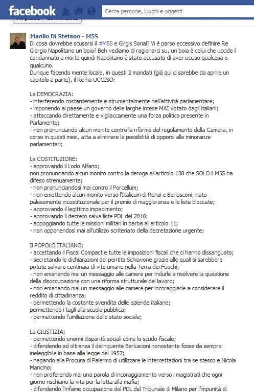 “Vi è parso eccessivo definire Re Giorgio Napolitano un boia? Beh vediamo di ragionarci su, un boia è colui che uccide il condannato a morte quindi Napolitano è stato accusato di aver ucciso qualcosa o qualcuno. Dunque facendo mente locale, in questi 2 mandati (già qui ci sarebbe da aprire un capitolo a parte), il Re ha ucciso: la democrazia, la Costituzione, il popolo italiano, la giustizia”. E, dunque, “se boia vi sembra eccessivo allora trovate voi un aggettivo che racchiuda tutti questi crimini contro il popolo italiano”.