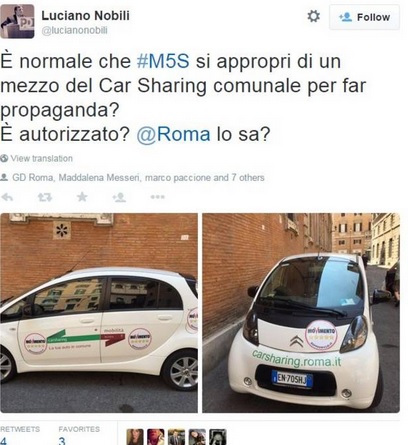 ROMA – L’esponente del Pd romano Luciano Nobili pubblica su Twitter una foto che mostra un mezzo del Car Sharing del comune di Roma, marchiata con lo stemma del Moviemnto 5 Stelle: “È normale che M5S si appropri di un mezzo del Car Sharing comunale per far propaganda? È autorizzato? @Roma lo sa?” twitta Nobili che, spiega, alla guida dell’auto marchiata 5 stelle c’erano “senatori M5S”.