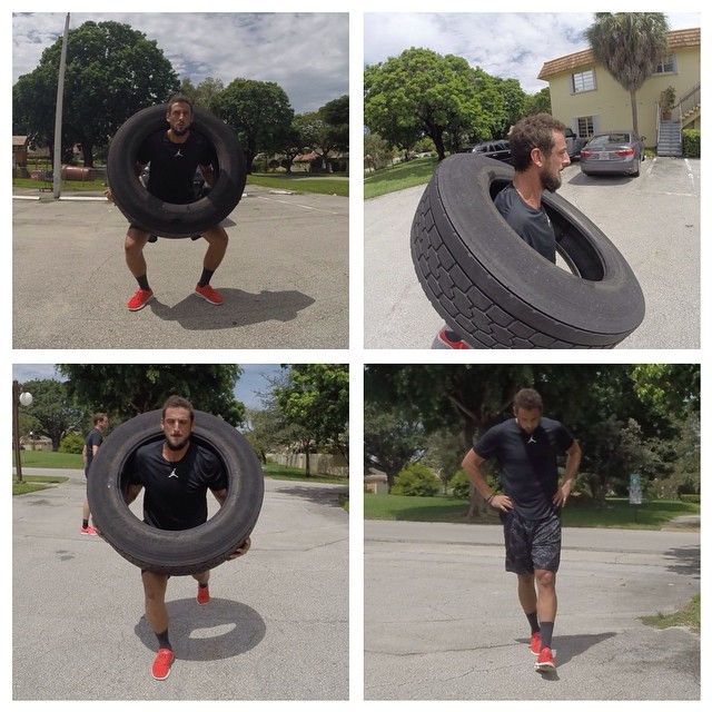 Belinelli si sta allenando duramente per essere a massimo della forma e oltre alle sedute in palestra si cimenta nel trascinare automobili e sollevare pneumatici da camion.