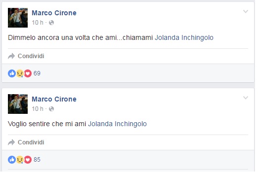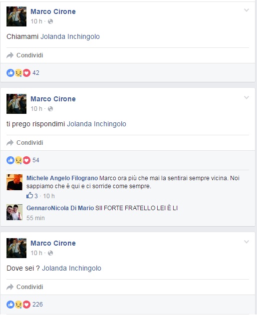 Bella e sorridente nelle foto su Facebook, abbracciata al suo Marco, Jolanda ora non c’è più. Lui la cerca, insistentemente, con i tag che rimandano alla bacheca ormai orfana di lei. “Jolanda rispondimi”, ma Jolanda non può. La disperazione e l’incredulità di un ragazzo così innamorato è straziante. Non può capacitarsi di aver perso la donna che “avrebbe dovuto diventare la madre dei miei figli”.