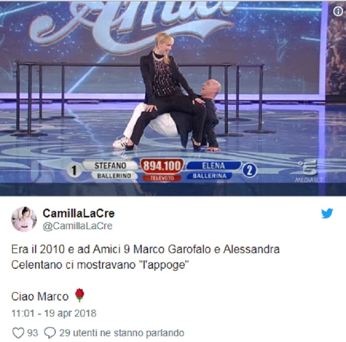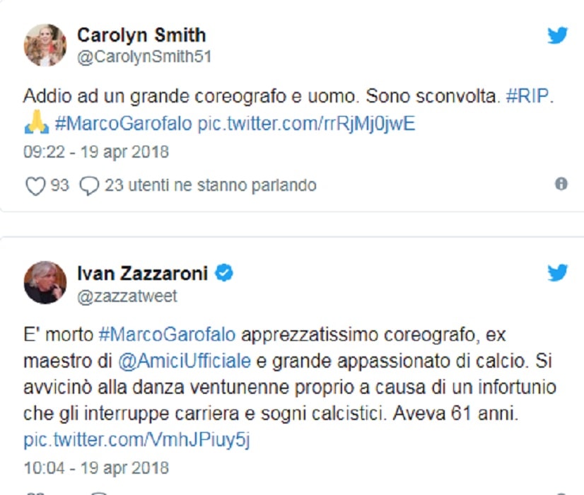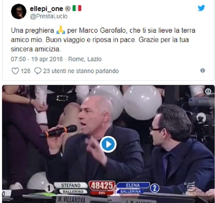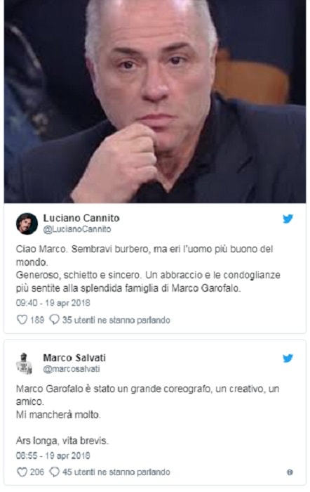 A ricordarlo è Luciano Cannito che ha partecipato ad Amici ricoprendo lo stesso ruolo. Su Twitte, Cannito lo ricorda scrivendo: ” Sembravi burbero, ma eri l’uomo più buono del mondo. Generoso, schietto e sincero. Un abbraccio e le condoglianze più sentite alla splendida famiglia di Marco Garofalo”.