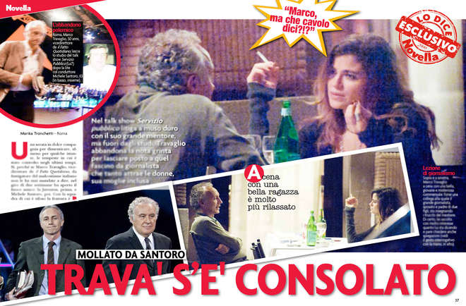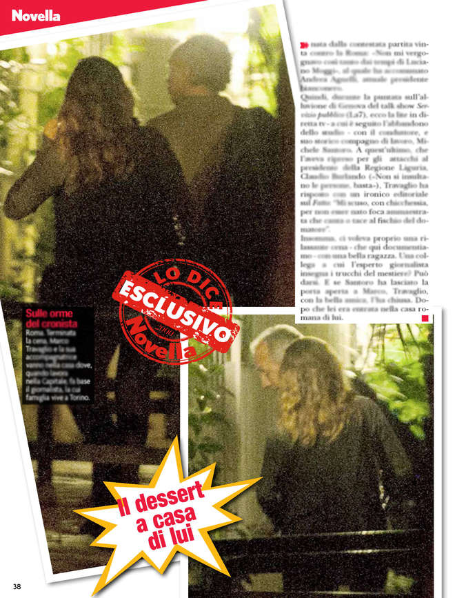 Novella2000 continua: “Ci voleva proprio una rilassante cena con una bella ragazza. Una collega a cui l’esperto giornalista insegna i trucchi del mestiere? Può darsi. E se Santoro ha lasciato la porta aperta a Marco, Travaglio, con la bella amica, l’ha chiusa. Dopo che lei era entrata nella casa romana di lui.”