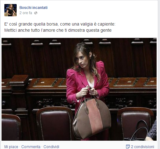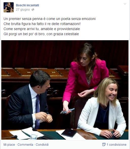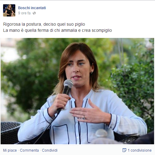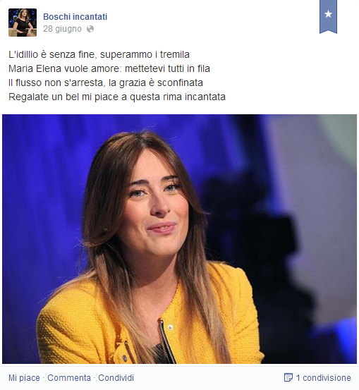 ROMA – Si chiama “Boschi incantati” e anche se si presenta come “personaggio politico” altro non è che una pagina Facebook del tutto originale dedicata al ministro Maria Elena Boschi. Nessuna offesa e nessuna volgarità, anzi: Boschi incantati è una pagina di poesie.
