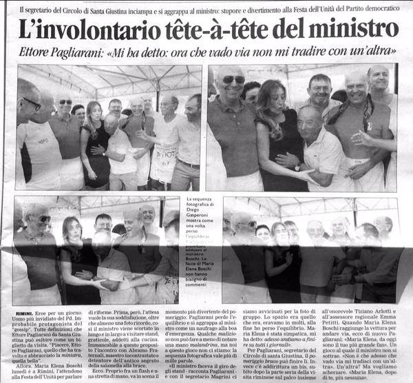 “Per Pagliarani, segretario del Circolo di santa Giustina, il pomeriggio bravo può finire lì. Invece c’è addirittura un bis, subito dopo la parte seria della visita riminese sul palco insieme all’onorevole Tiziano Arlotti e all’assessore regionale Emma Petitti. Quando Maria Elena Boschi raggiunge la vettura per andare via, ecco di nuovo Pagliarani: ‘Maria Elena, da oggi sono il tuo più grande fan’. Un gioco al quale il ministro non si sottrae. ‘Non è che adesso che vado via mi tradisci con un’altra’. Un’altra? Ma vogliamo scherzare. ‘Maria Elena, dopo di te, più nessuna”‘.