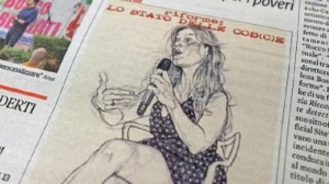 Ma, come racconta Dagospia, il vignettista Riccardo Mannelli, per la realizzazione del disegno, ha preso spunto ovviamente dalla Boschi stessa, ma in particolare dalle foto di Maria Elena Boschi che parla di riforme in piazza ad Alessandria.