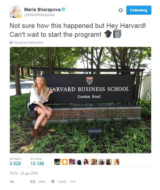 L’atleta ha dato la notizia sui suoi account Twitter e Facebook dove ha postato anche delle foto: “Non sono sicura come sia successo, ma ‘hey Harvard, non vedo l’ora di cominciare'”. La tennista non ha spiegato quale titolo coneguirà nella prestigiosa Università: l’unica cosa nota è il fatto che il corso durerà due settimane e si terrà durante l’estate.