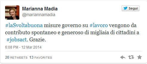 Agganciadosi all’hashtag #laSvoltabuona”, nuovo slogan del governo Renzi, Madia ha spiegato che le “misure del governo sul lavoro vengono dal contributo spontaneo e generoso di migliaia di cittadini al Jobs act”.
