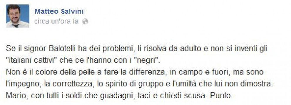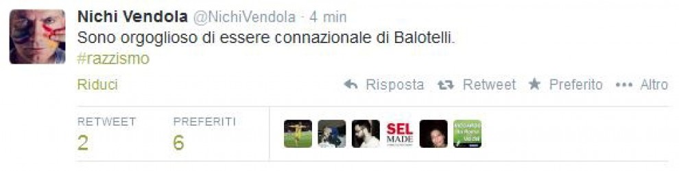 ROMA – Nichi Vendola si schiera apertamente a favore di Mario Balotelli scrivendo su Twitter: “Sono orgoglioso di essere connazionale di Balotelli”. Al leader si Sinistra Ecologia e Libertà fa eco il leader della Lega Nord Matteo Salvini che su Facebook lo attacca: “Se il signor Balotelli ha dei problemi, li risolva da adulto e non si inventi gli ‘italiani cattivi’ che ce l’hanno con i ‘negri'”.