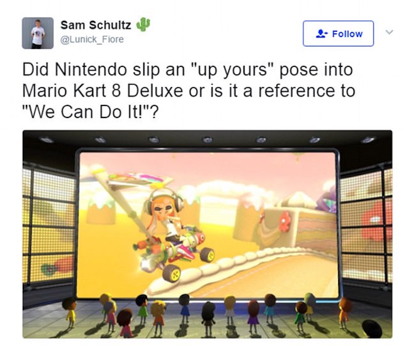 Nelle immagini originali di Inkling Girl, un personaggio di Mario Kart 8 Deluxe per schernire gli avversari si esibisce nel tipico gesto dell’ombrello, mandare senza giri di parole a quel paese, che in molti paesi europei e sudamericani, è considerato offensivo, spiega il Daily Mail.