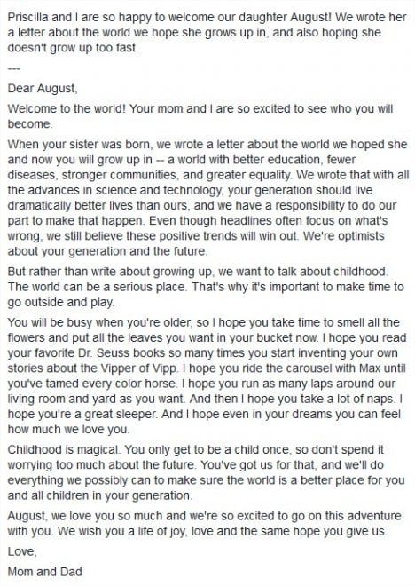 Mark Zuckerberg di nuovo papà. Il fondatore di Facebook annuncia la nascita della sua secondogenita, August, con una lettera pubblica sulla sua pagina Facebook: