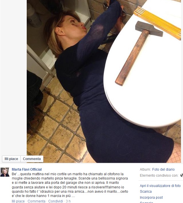 ROMA – Vi ricordate Marta Flavi? A giudicare da questa foto postata sul suo profilo facebook “Marta Flavi Official“, pare faccia l’idraulico… peccato che sia vestita e truccata di tutto punto e con le calze a rete.