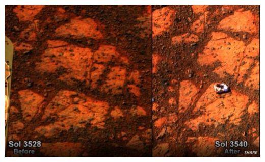 1 – “Opportunity (….) si è leggermente mosso e, dato che ha una ruota bloccata, potrebbe nel movimento fatto schizzare un sassetto (con la gravità ridotta di Marte è più facile) che è finito di lato proprio di fronte all’obiettivo della macchina fotografica.
